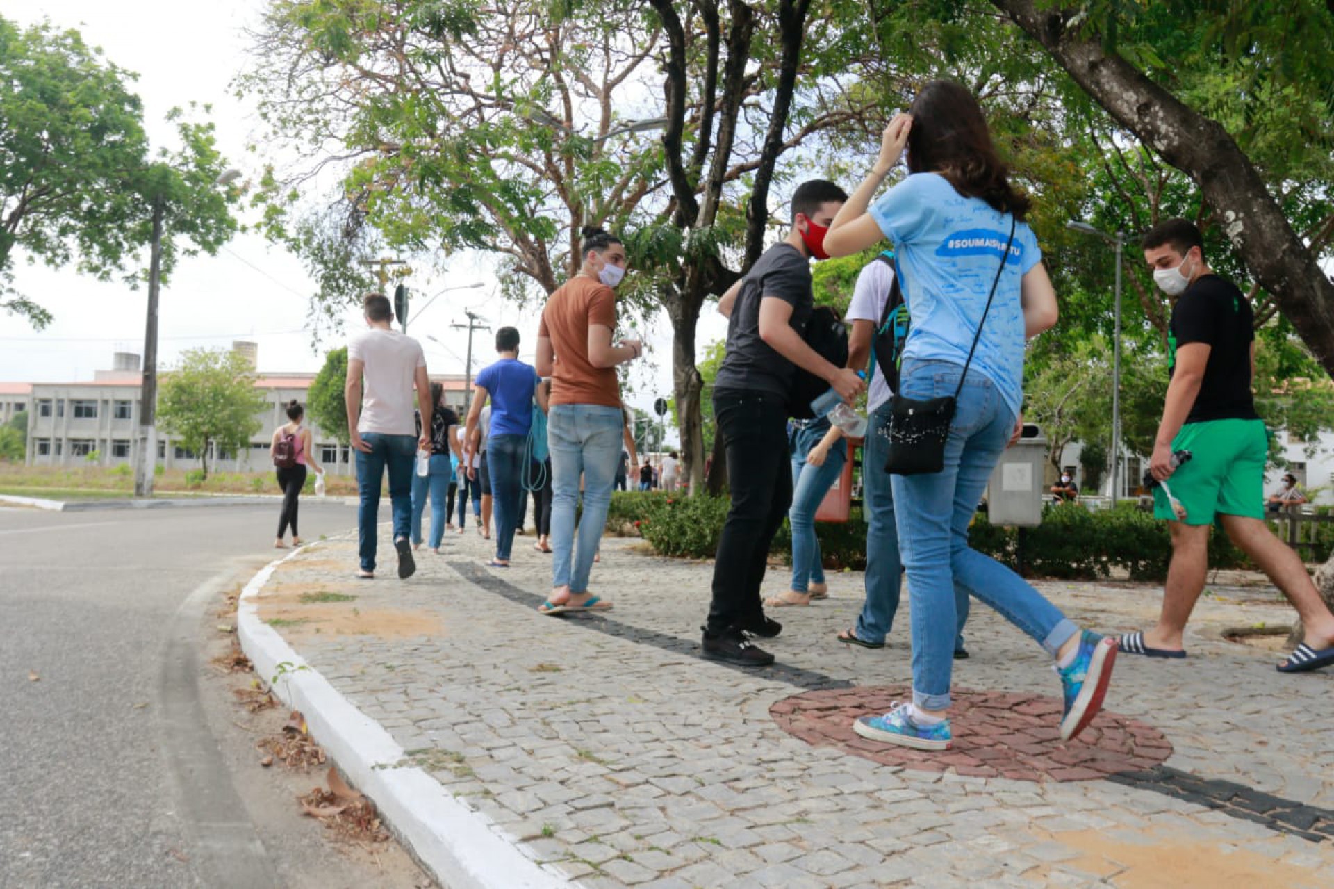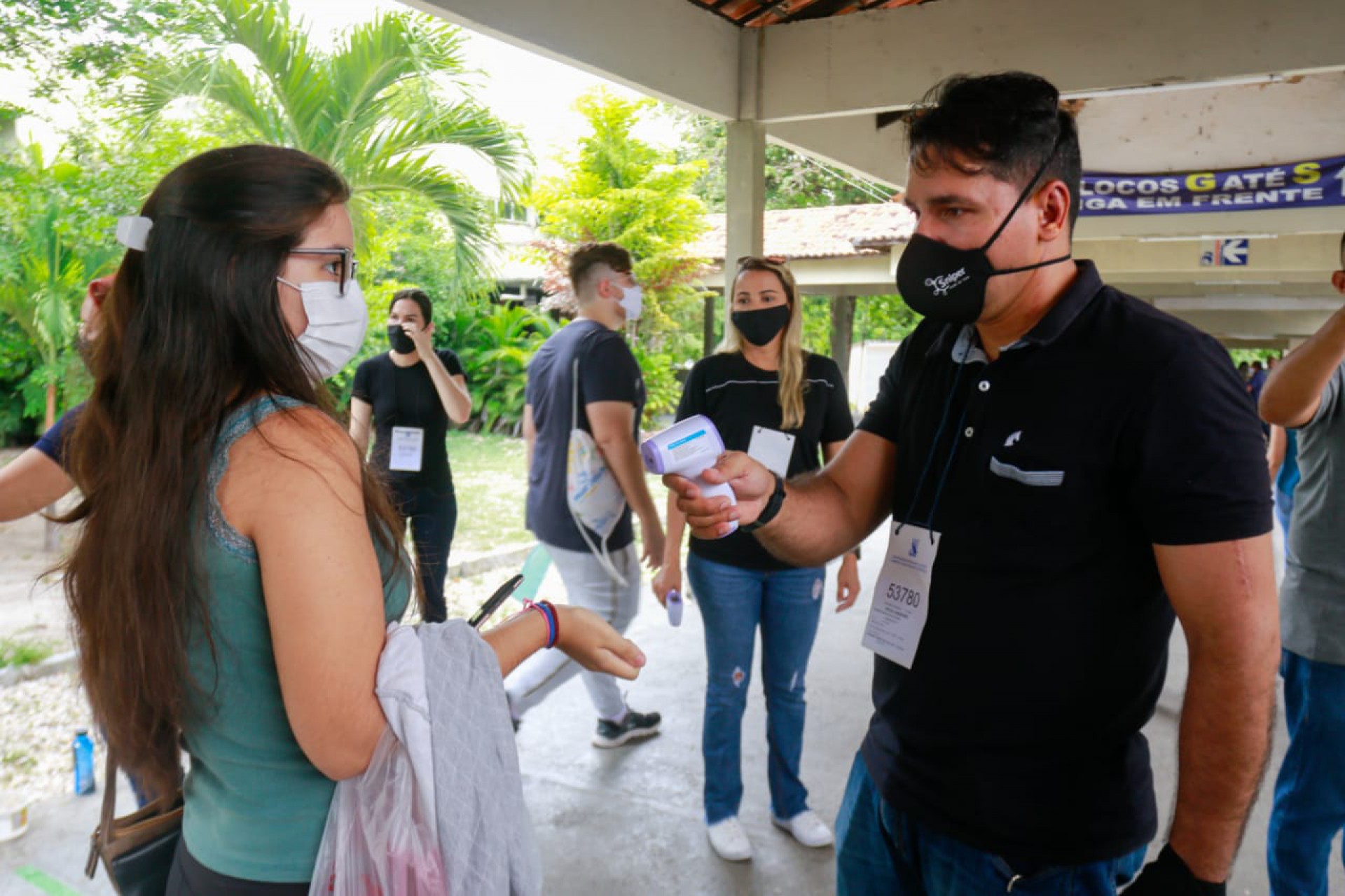 Segundo Fábio Perdigão, presidente da Comissão Executiva do Vestibular (CEV), essas ações respeitam as determinações do Governo do Estado do Ceará. “Entre as medidas, podemos dizer que, primeiro, todas as salas foram higienizadas com uma solução a base de água sanitária. Há o distanciamento de 1,5 metro entre as carteiras e não há aproximação entre os candidatos. Na entrada do campus, de cada lugar de prova, foi aferida à temperatura”, explica. De acordo com ele, não houve casos de pessoas com temperatura acima dos 37 graus. Além disso, a universidade disponibiliza máscara para aqueles que não trouxeram as próprias.