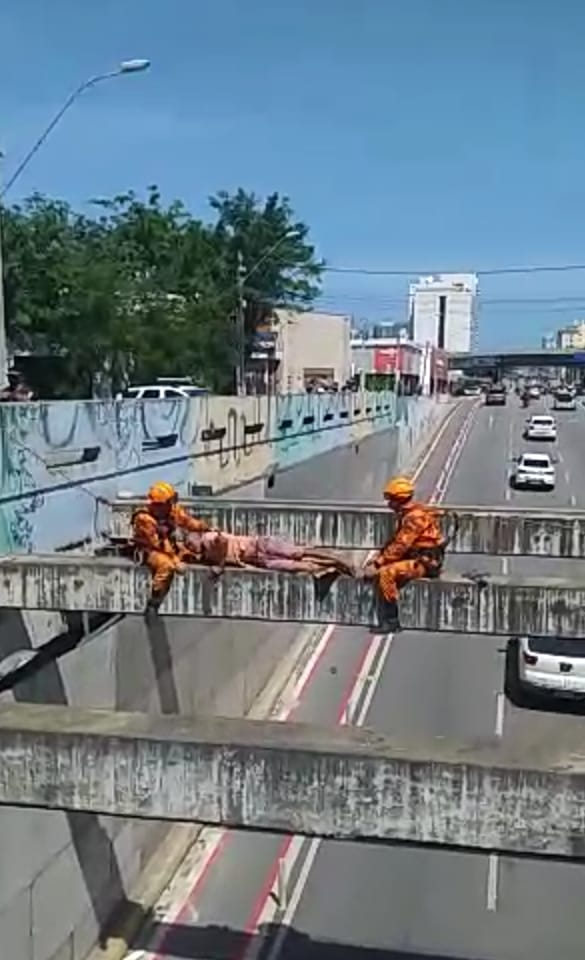 Em imagens gravadas por pessoas que passavam pelo local, é possível ver o momento em que o homem é encontrado deitado em cima da viga, aparentemente desacordado. Enquanto ele dormia, veículos de todo porte passavam na avenida, logo abaixo de seu corpo.