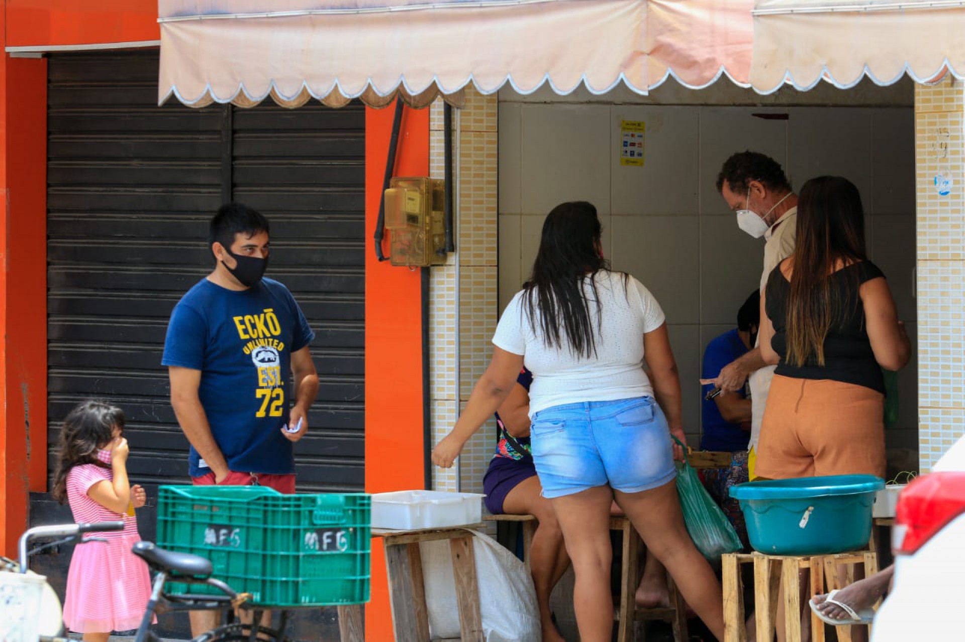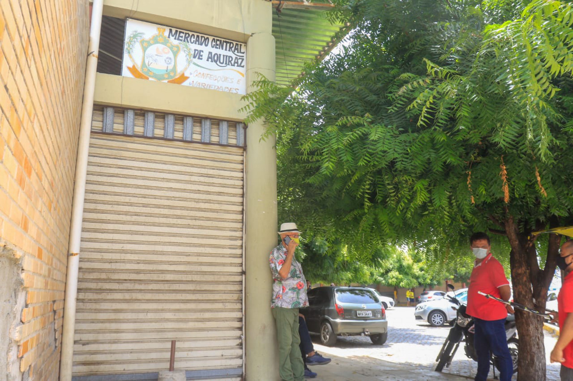 Algumas pessoas - com máscaras - transitavam pelas ruas do Centro Comercial do município. Funcionavam estabelecimentos permitidos pelo atual Decreto (Nº 33.980, de 12 de março de 2021), como mercadinhos, supermercado, serviço odontológico, padaria e outros. O Mercado Central de Aquiraz estava fechado.