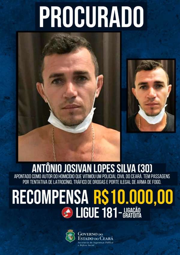 O maior valor, de R$ 10 mil, é concedido por informações de Antônio Josivan Lopes Silva, 30. O homem, que possui passagens por tentativa de latrocínio, tráfico de drogas e porte ilegal de arma de fogo, é apontado como autor do homicídio que vitimou o policial civil Aloizio Alves de Lima Amorim, 60, no último dia 30 de abril, em Tauá.