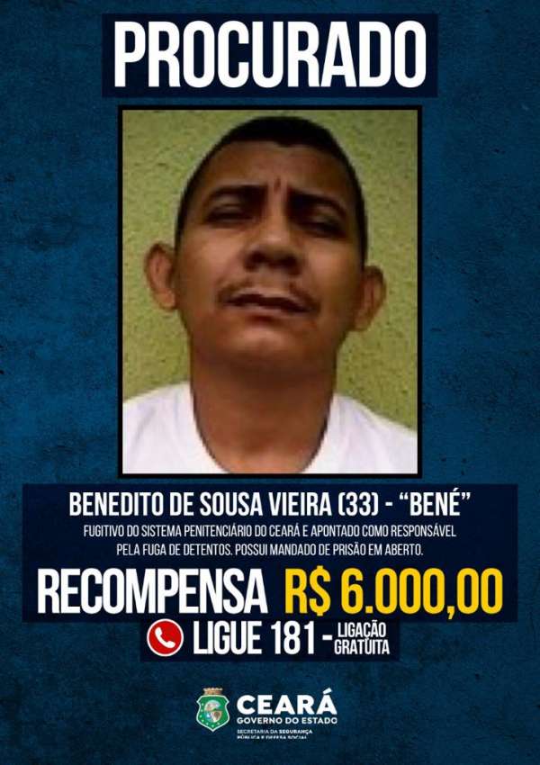 Já “Bené”, que possui passagens por homicídio doloso e dano, é apontado como o responsável pela fuga de detentos da cadeia pública de Santa Quitéria, unidade prisional da qual também é foragido. Contra ele, há um mandado de prisão em aberto pelos crimes.