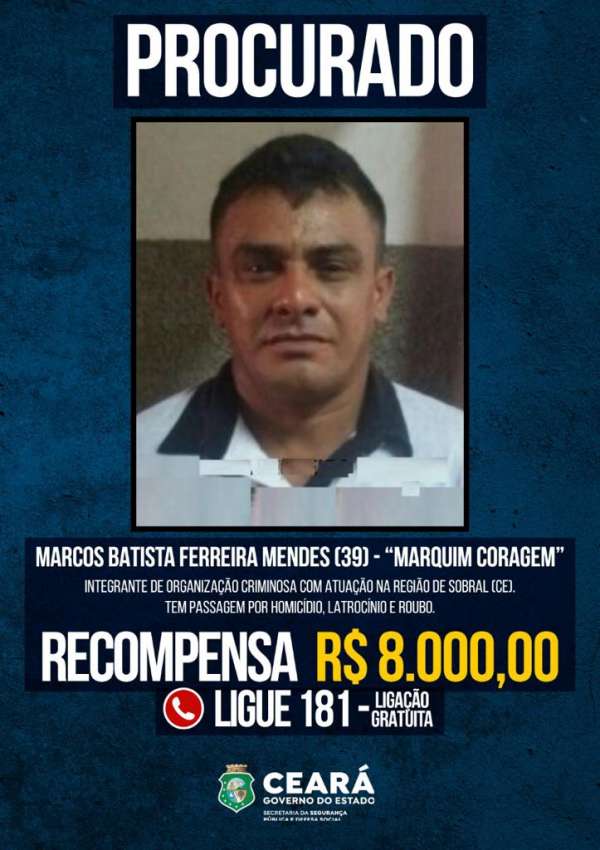 De acordo com as investigações, os homens são apontados como integrantes de um coletivo criminoso atuante na cidade de Sobral, na região Norte do Ceará. A recompensa para quem repassar informações que auxiliem na localização da dupla é de R$ 8 mil, para cada suspeito.