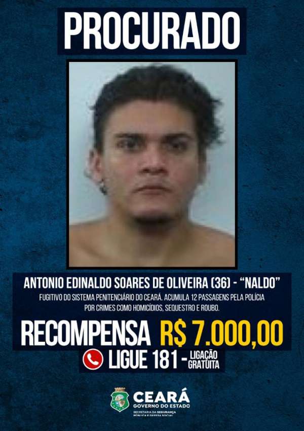 Já Antonio Edinaldo Soares de Oliveira, 36, conhecido como “Naldo”, acumula 12 passagens pela polícia no Ceará pelos crimes de homicídio doloso, sequestro e cárcere privado, extorsão, associação criminosa, roubo, roubo de veículos, posse e porte ilegal de arma de fogo, dano e posse de drogas. Ele é fugitivo do sistema penitenciário desde 2020.