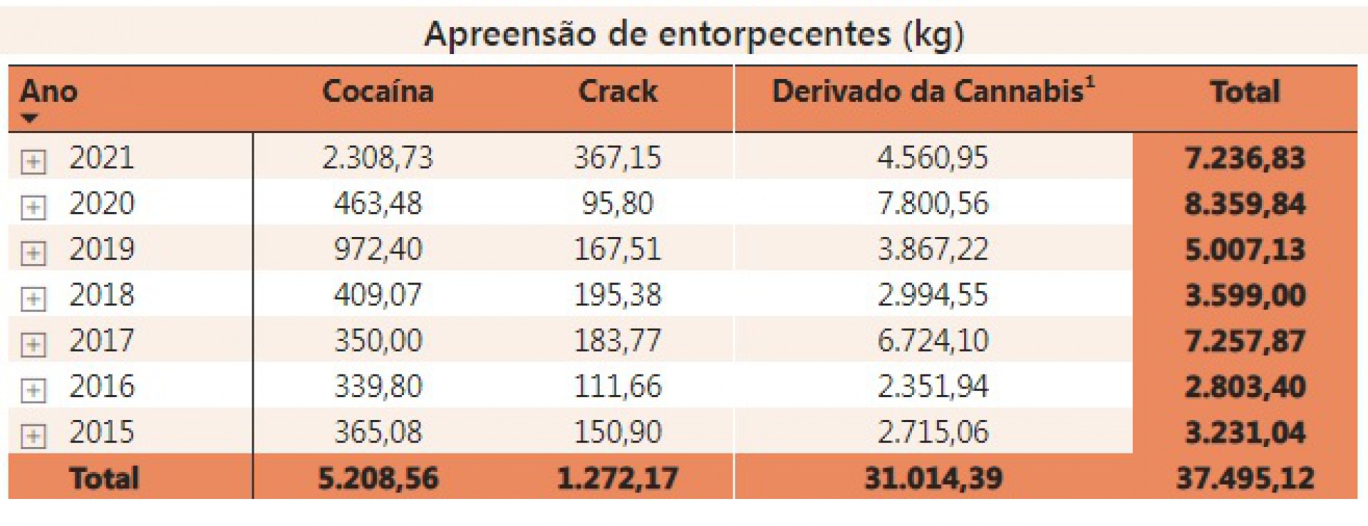 O ano de 2021 foi o terceiro melhor em apreensão de drogas da série histórica disponibilizada pela SSPDS. O número ficou abaixo do registrado em 2020, quando 8,3 toneladas de drogas foram apreendidas. Apesar disso, a apreensão de cocaína aumentou cinco vezes. Em 2020, 463,48 quilos de cocaína haviam sido apreendidos. Também a apreensão de crack aumentou em 2021 na comparação com 2020. Foram 95,8 quilos apreendidos em 2020. A maconha representou a maior parte das apreensões naquele ano, com 7.800,5 toneladas apreendidas.