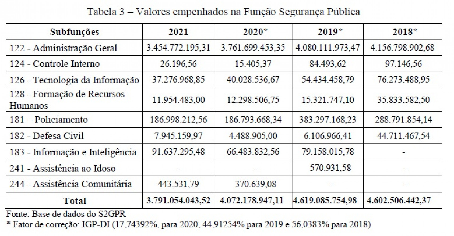 O relatório apontou que as principais despesas da segurança pública do Estado em 2021 foram as subfunções de Administração Geral (R$ 3,45 bi) e de Policiamento (R$ 186,99 milhões.), que, juntas, correspondem a 96,06% do total empenhado. O relatório ainda apontou que o principal projeto de investimento com fonte do Tesouro estadual, na área de segurança pública em 2021, foi a construção de unidades de segurança pública: o investimento foi de R$ 102.273.273,57.