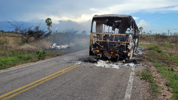 Fogo destrói ônibus e carro após acidente no interior do CE; vídeo