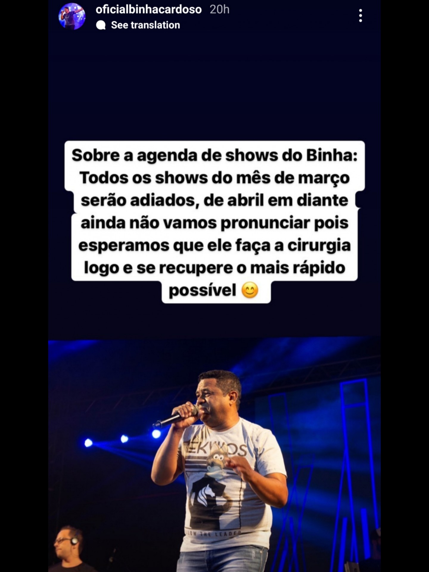 “Sobre a agenda de shows do Binha: todos os shows do mês de março serão adiados. De abril em diante ainda não vamos nos pronunciar, pois esperamos que ele faça a cirurgia logo e se recupere o mais rápido possível”, completou a nota.