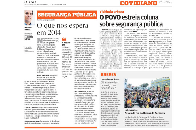Com o título “O que nos espera em 2014”, a coluna assinada pelo jornalista e sociólogo, Ricardo Moura, foi publicada pela primeira vez no dia 13 de janeiro de 2014. Nela, o colunista apresentou casos na área Segurança Pública que haviam ocorrido na primeira semana do ano que se iniciava.