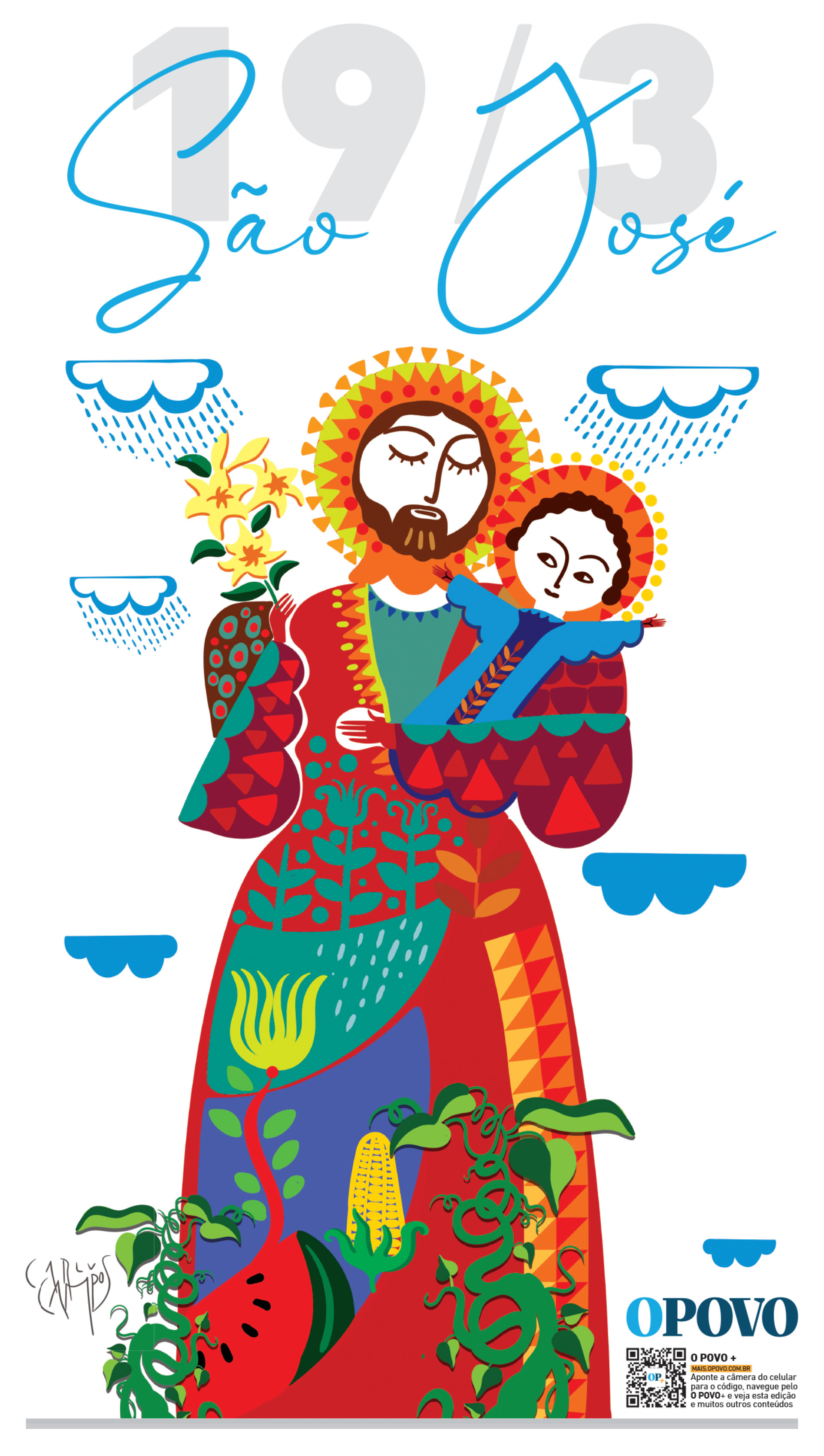 Nesta terça-feira, 19 de março (19/03), é comemorado o Dia de São José. O santo também é padroeiro do Ceará e é conhecido por interceder pelas chuvas no Estado. O jornal O POVO traz um pôster do santo nesta edição de terça. A ilustração é de Carlus Campos, do O POVO.