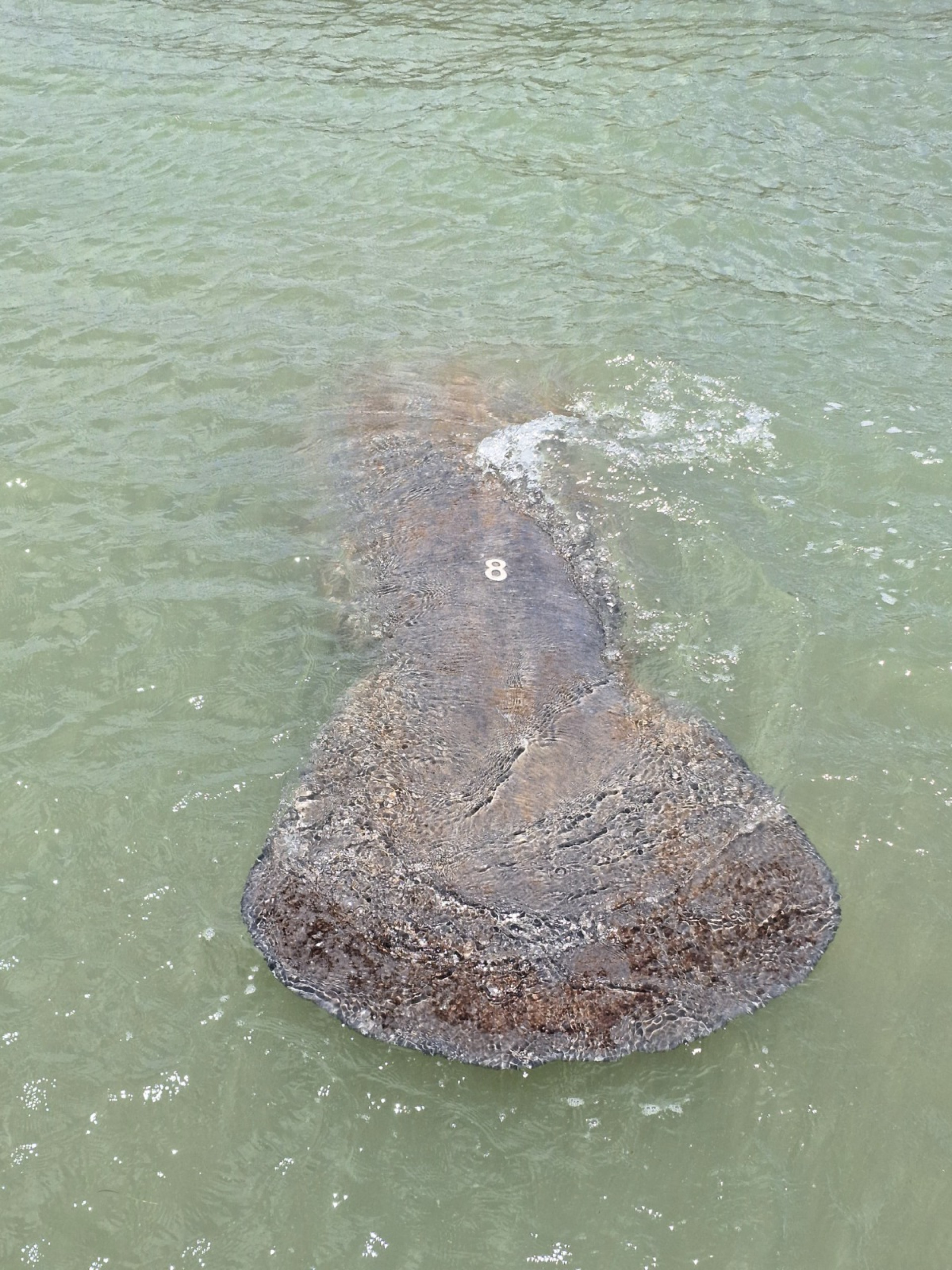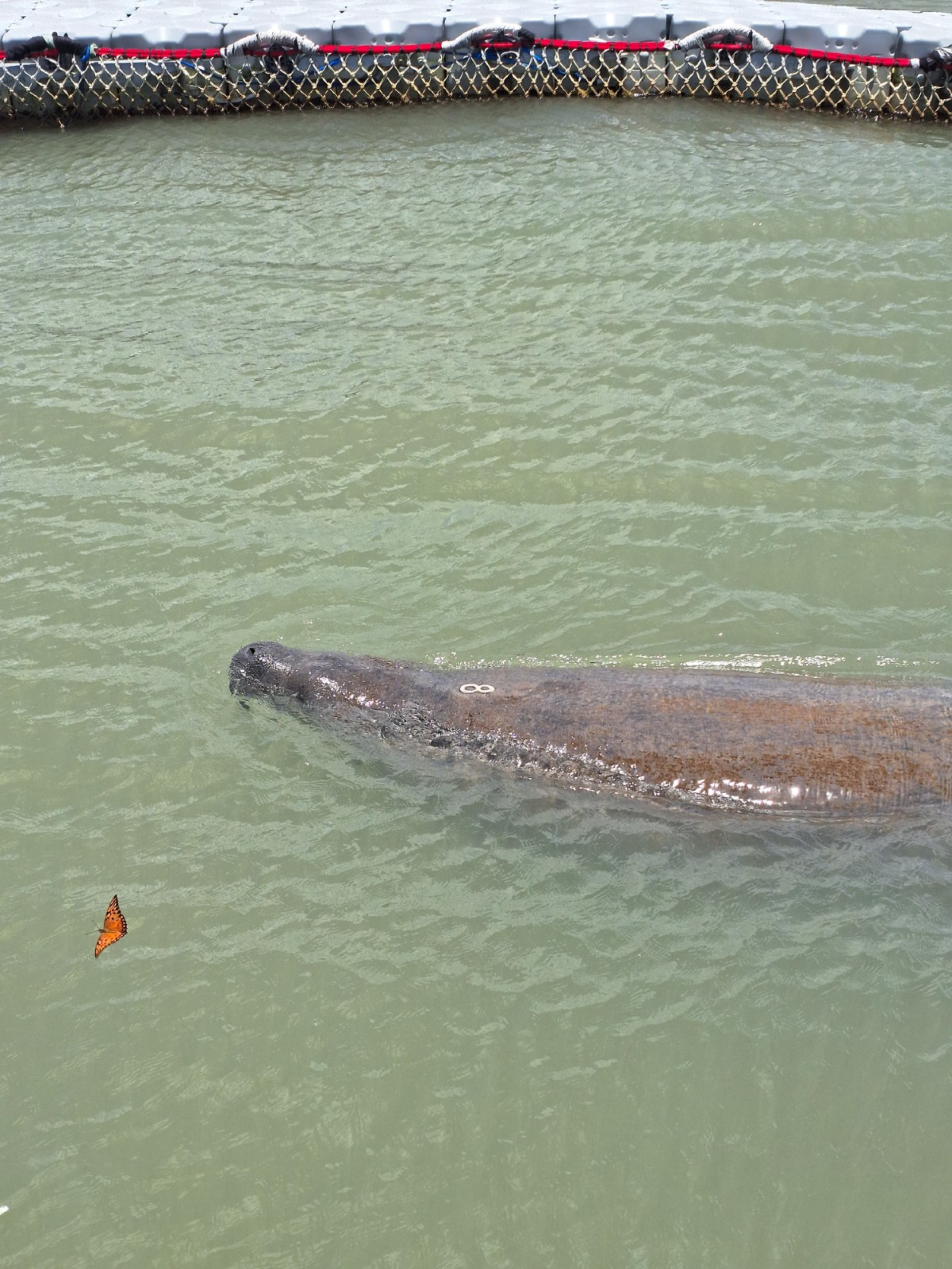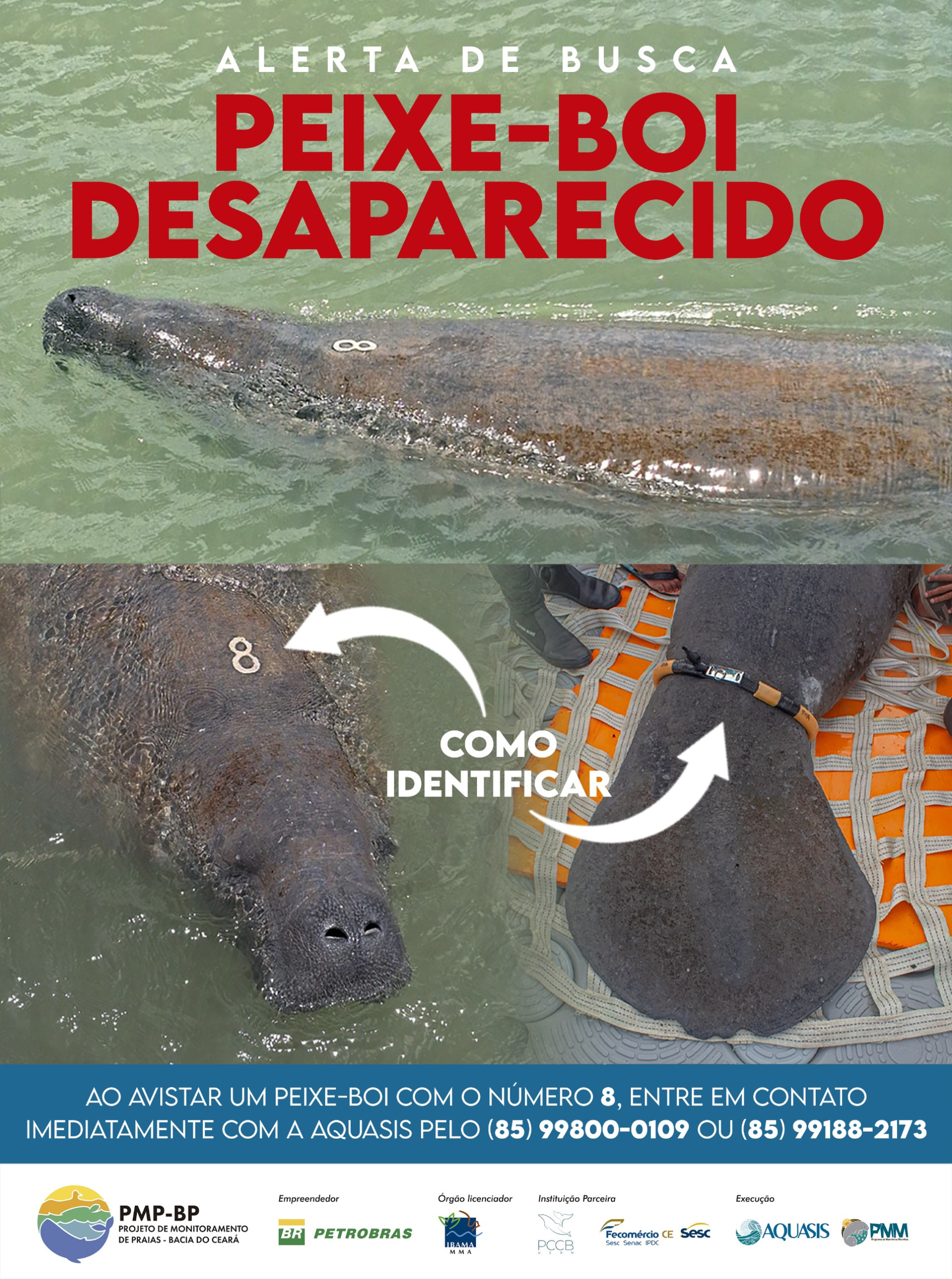 No entanto, o animal também pode e deve ser identificado de forma mais precisa, a partir do número oito gravado em sua cabeça. Além disso, o peixe-boi também está com um cinto de borracha na cauda.