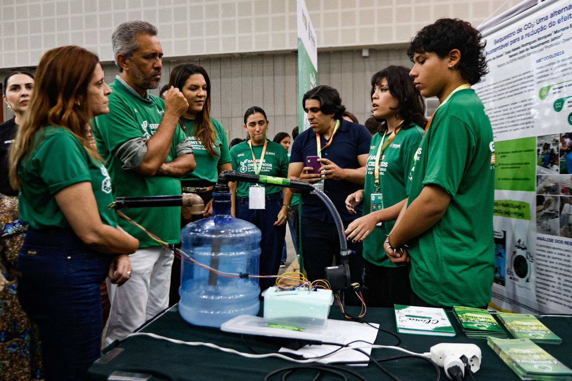 Já os estudantes Ítalo Rabelo, 17, e Mariana Evelyn, 16, são alunos da EEFM Aloysio Barros Leal, localizada no bairro Barroso, de Fortaleza. Eles apresentam o projeto “Sequestro de CO₂: Uma alternativa sustentável para a redução do efeito estufa”. Por meio de um painel solar, eles acionam uma bomba que captura ar atmosférico e remove o CO₂, devolvendo o ar purificado.