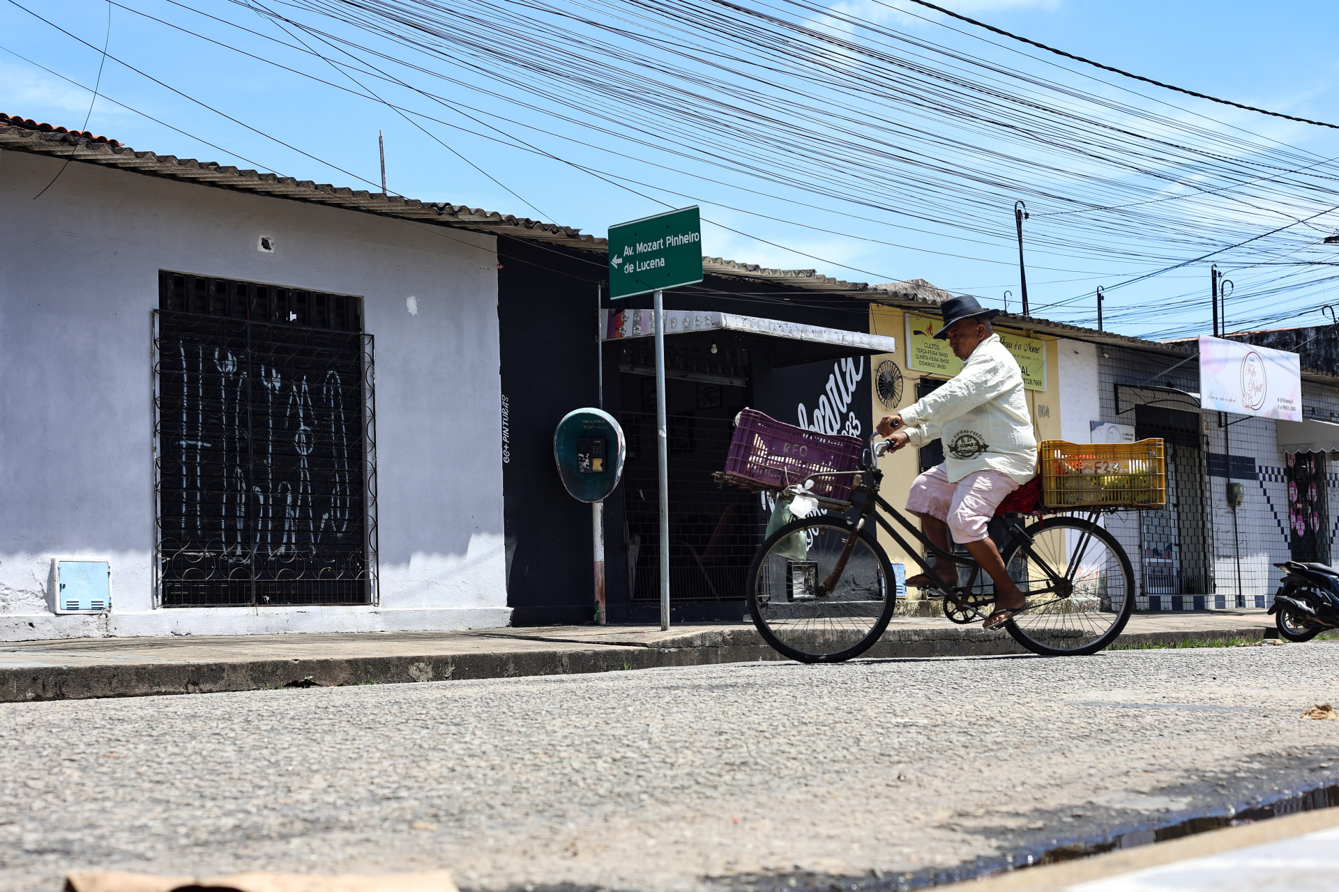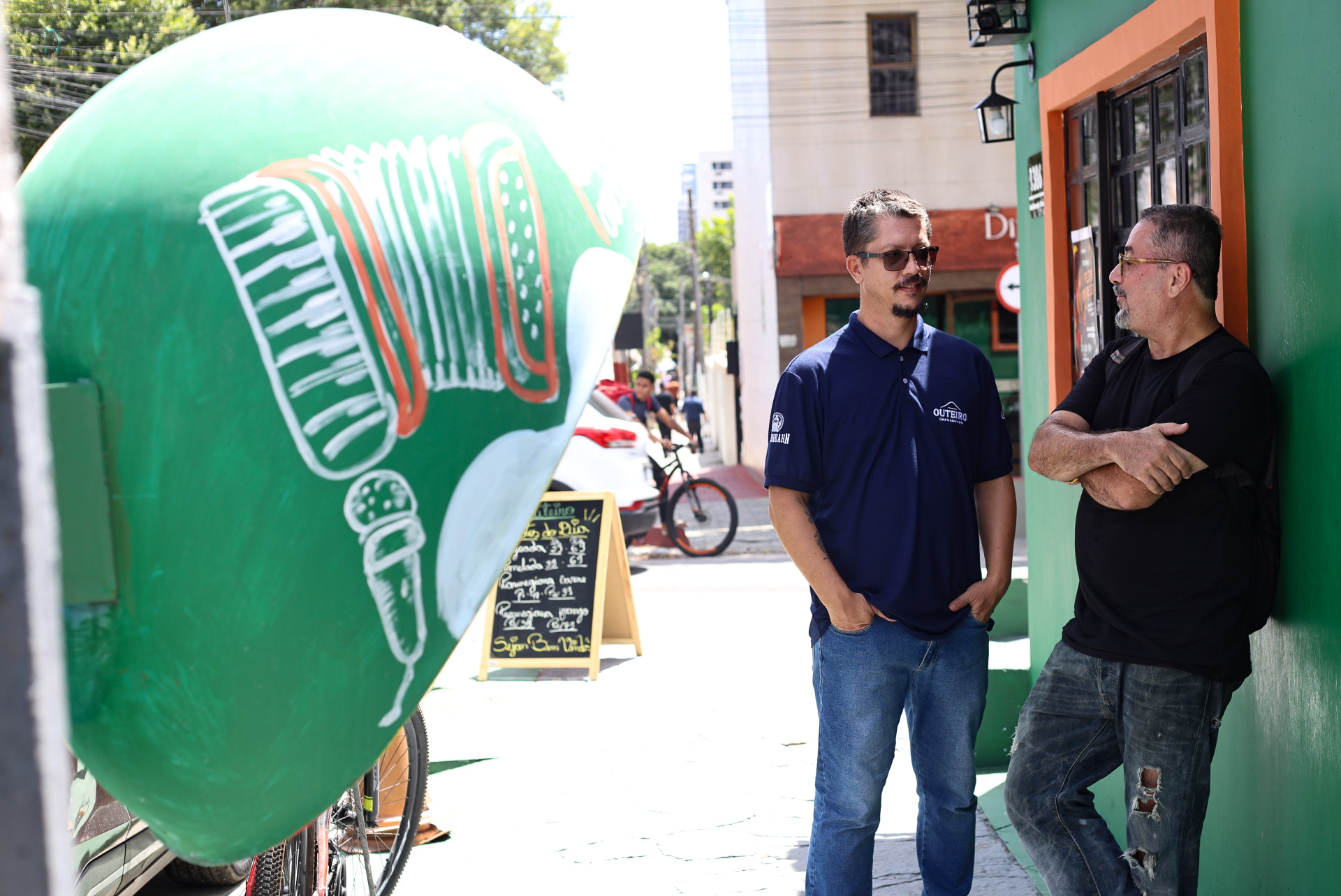 A intervenção dialoga com a fachada do estabelecimento ao lado, o recém-inaugurado Outeiro Restaurante e Bar. A iniciativa partiu do proprietário, Célio Paiva, 55. “Sobrou tinta e eu pensei: ‘Por que não ‘dar um grau’ nele? De repente ele fica ‘instagramável’, né?’”, conta.