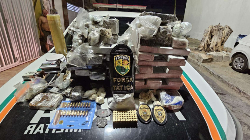 Foram apreendidos mais de 30 kg de maconha, 150 g de cocaína, 328 g de crack, além de 70 munições de calibre 9 mm e .40.