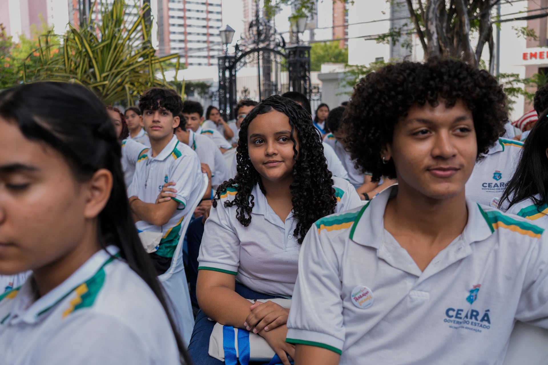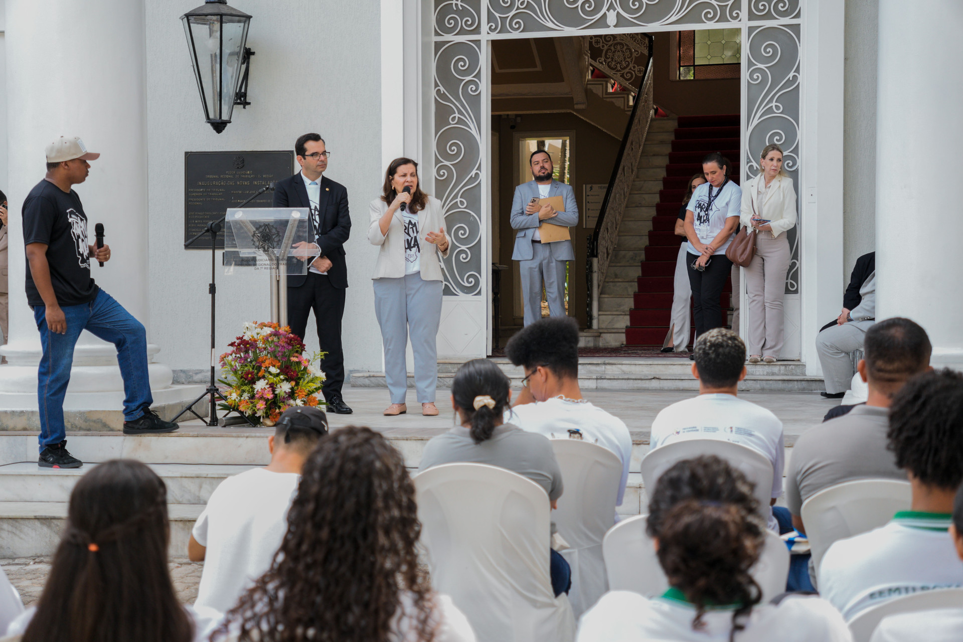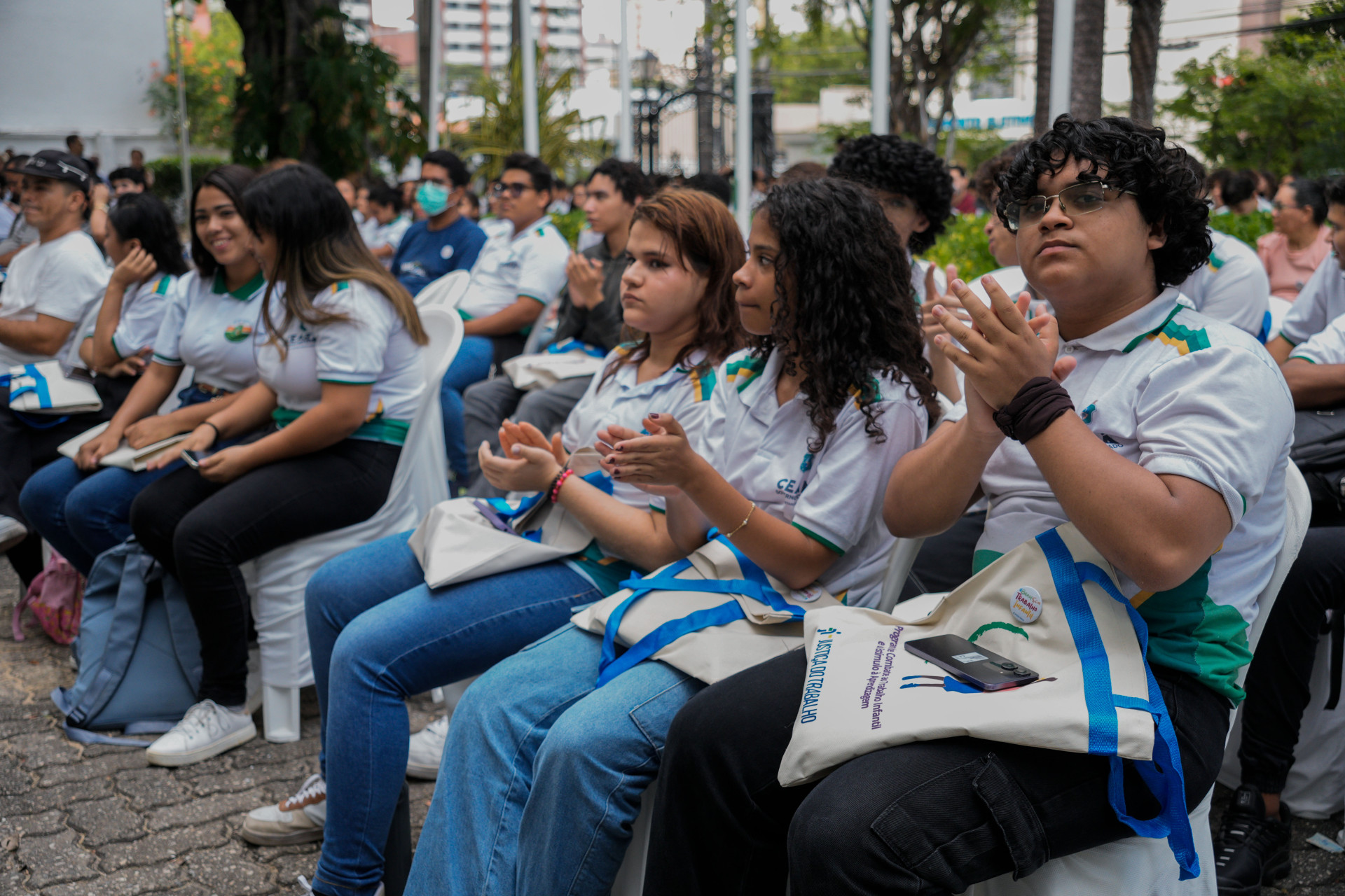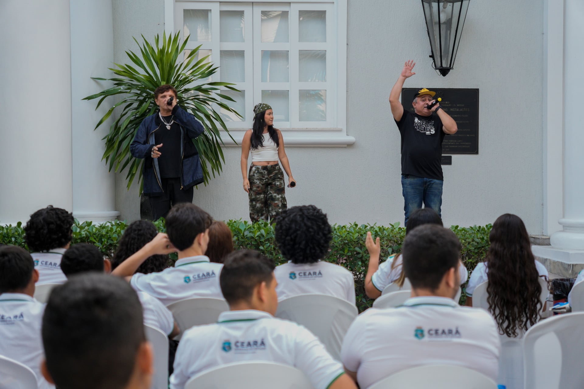 Concentrados na apresentação de hip-hop dos artistas, meninas e meninos das escolas públicas de Caucaia ocupavam o jardim do TRT-CE.