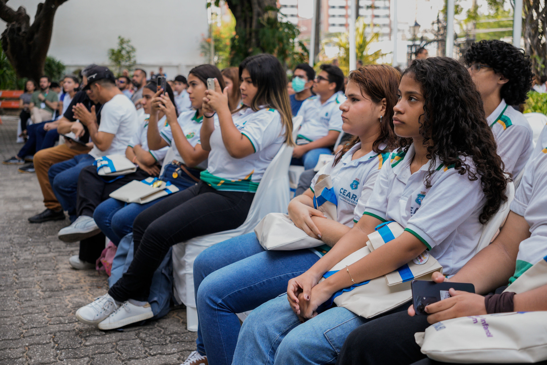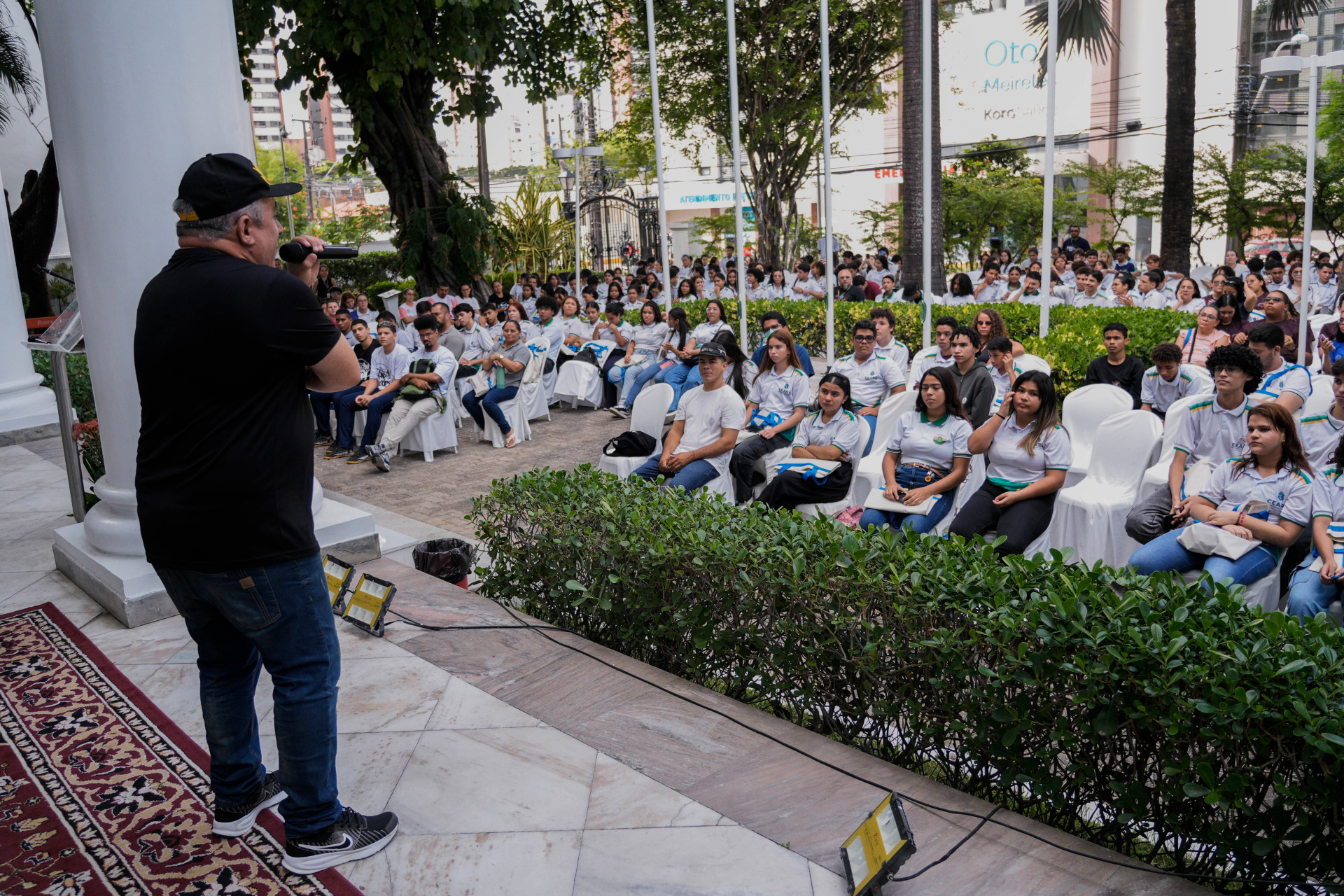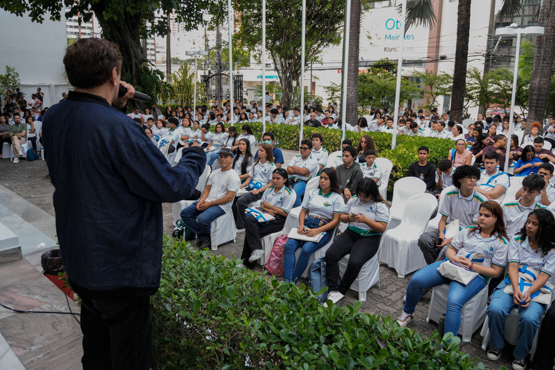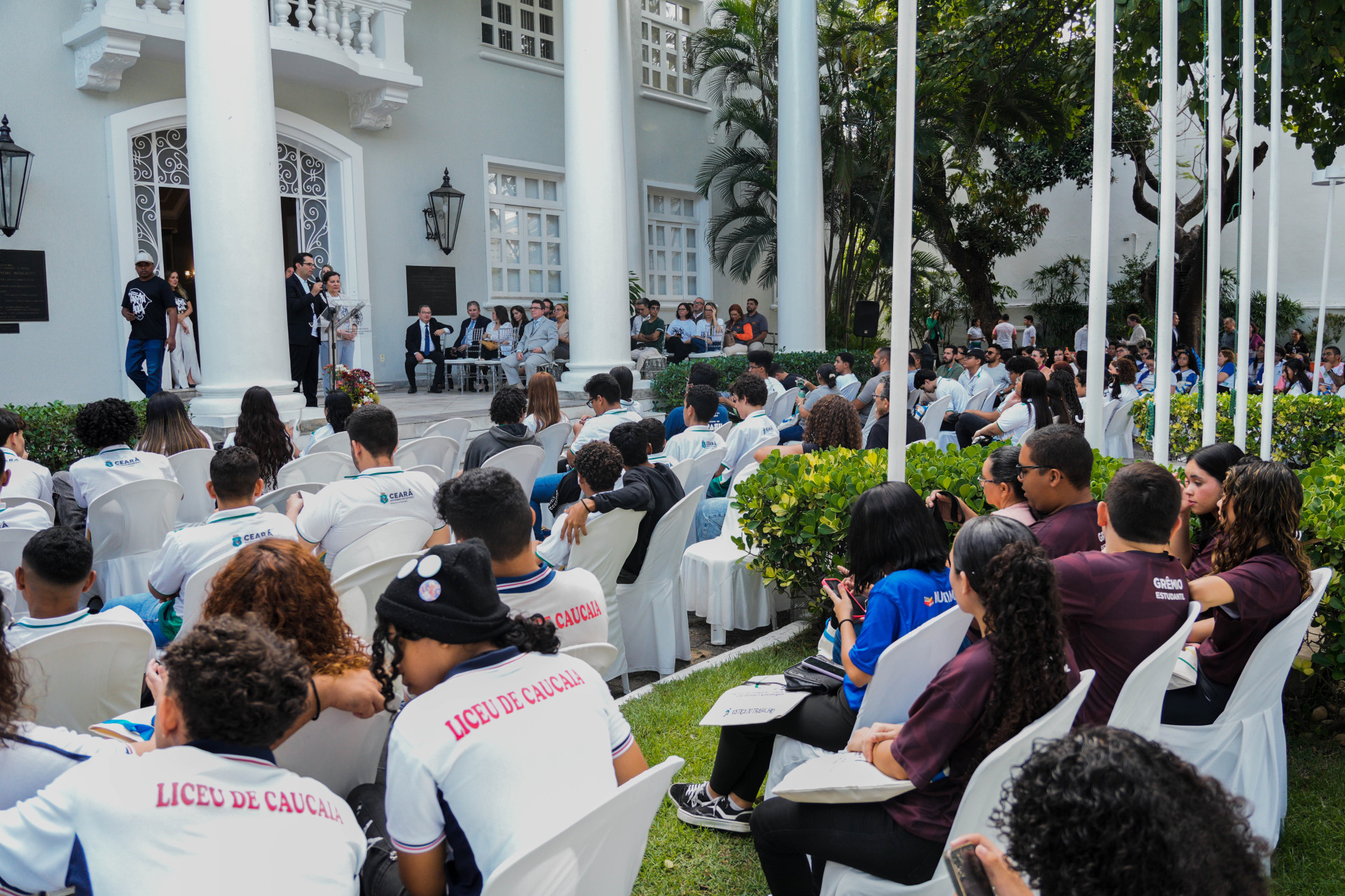 Concentrados na apresentação de hip-hop dos artistas, meninas e meninos das escolas públicas de Caucaia ocupavam o jardim do TRT-CE.