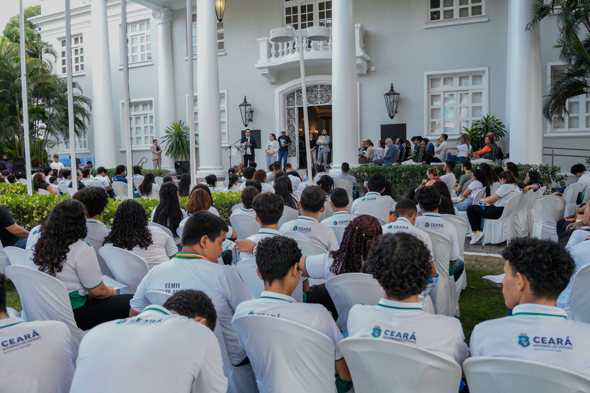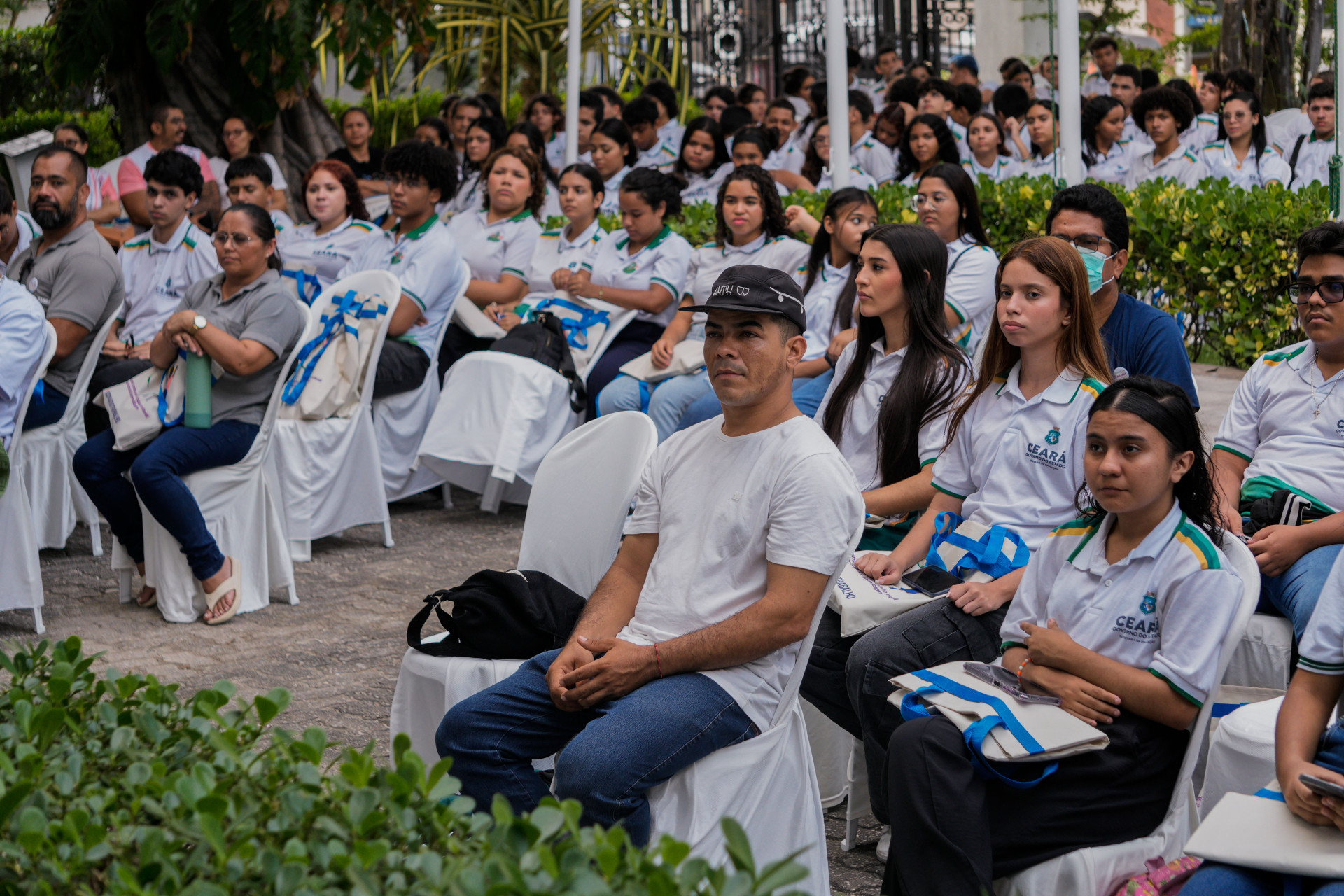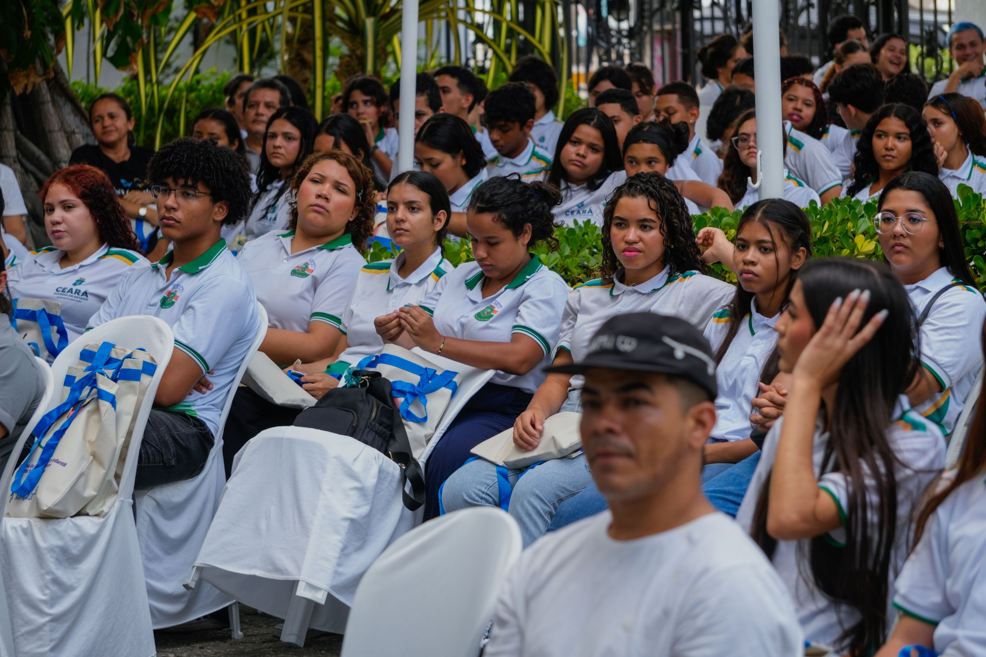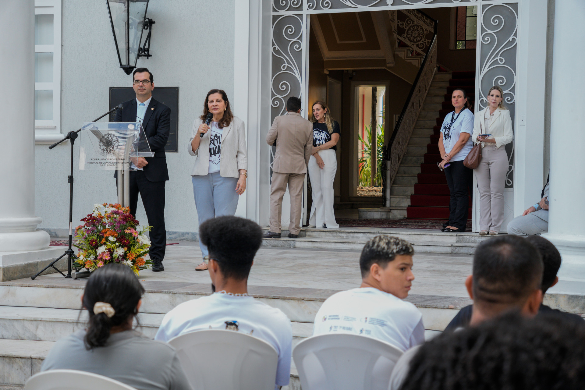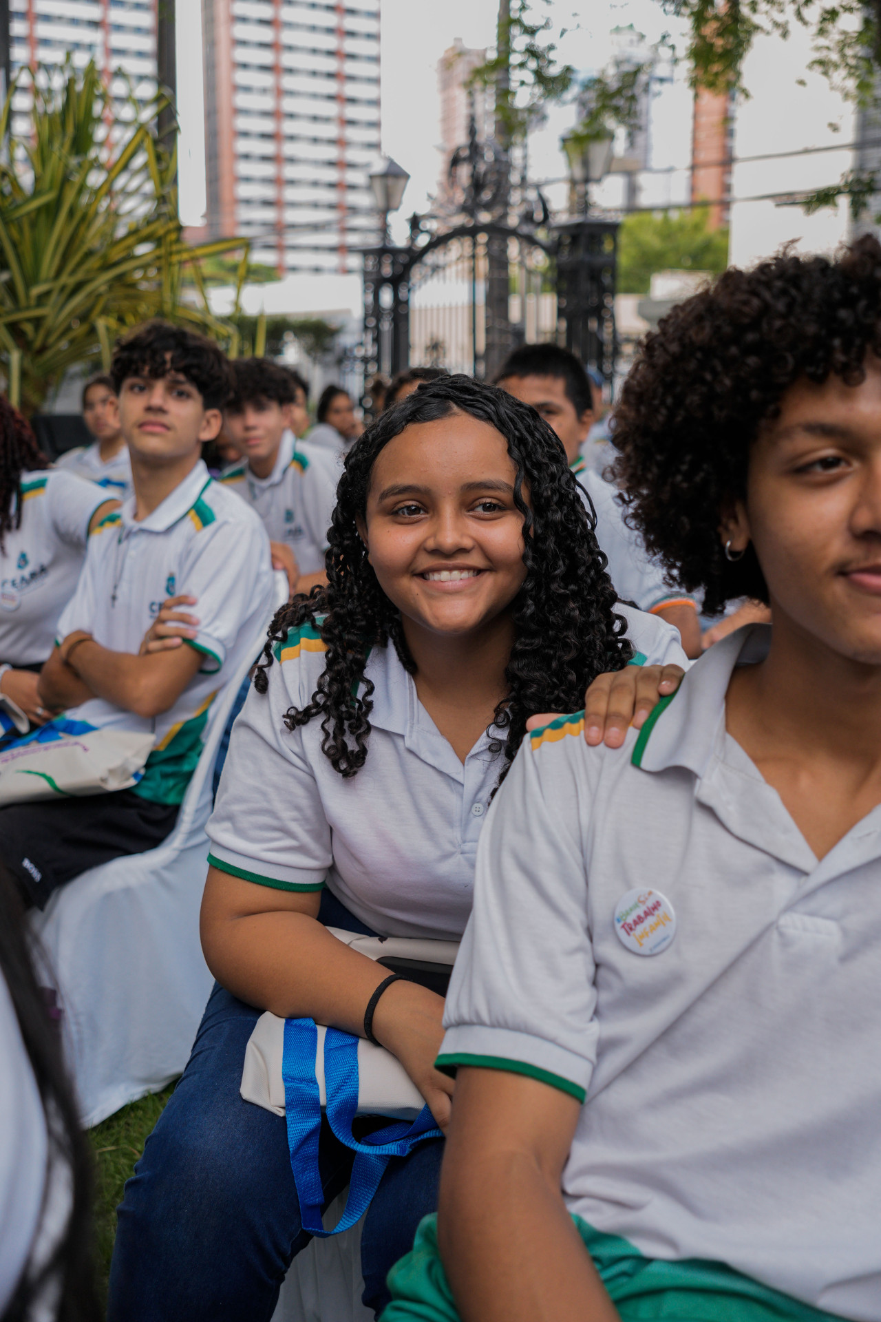Concentrados na apresentação de hip-hop dos artistas, meninas e meninos das escolas públicas de Caucaia ocupavam o jardim do TRT-CE.