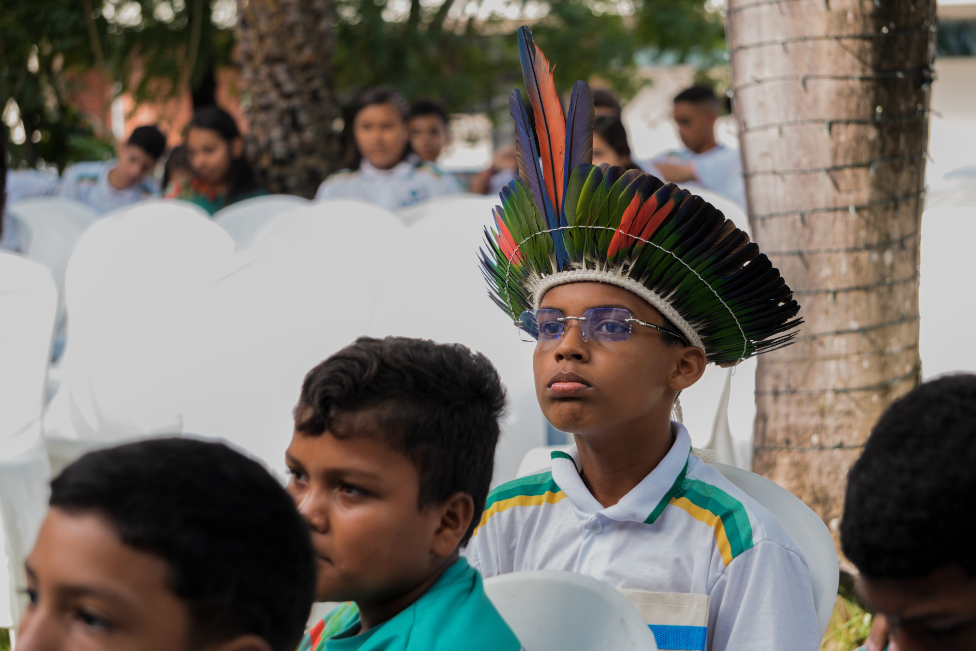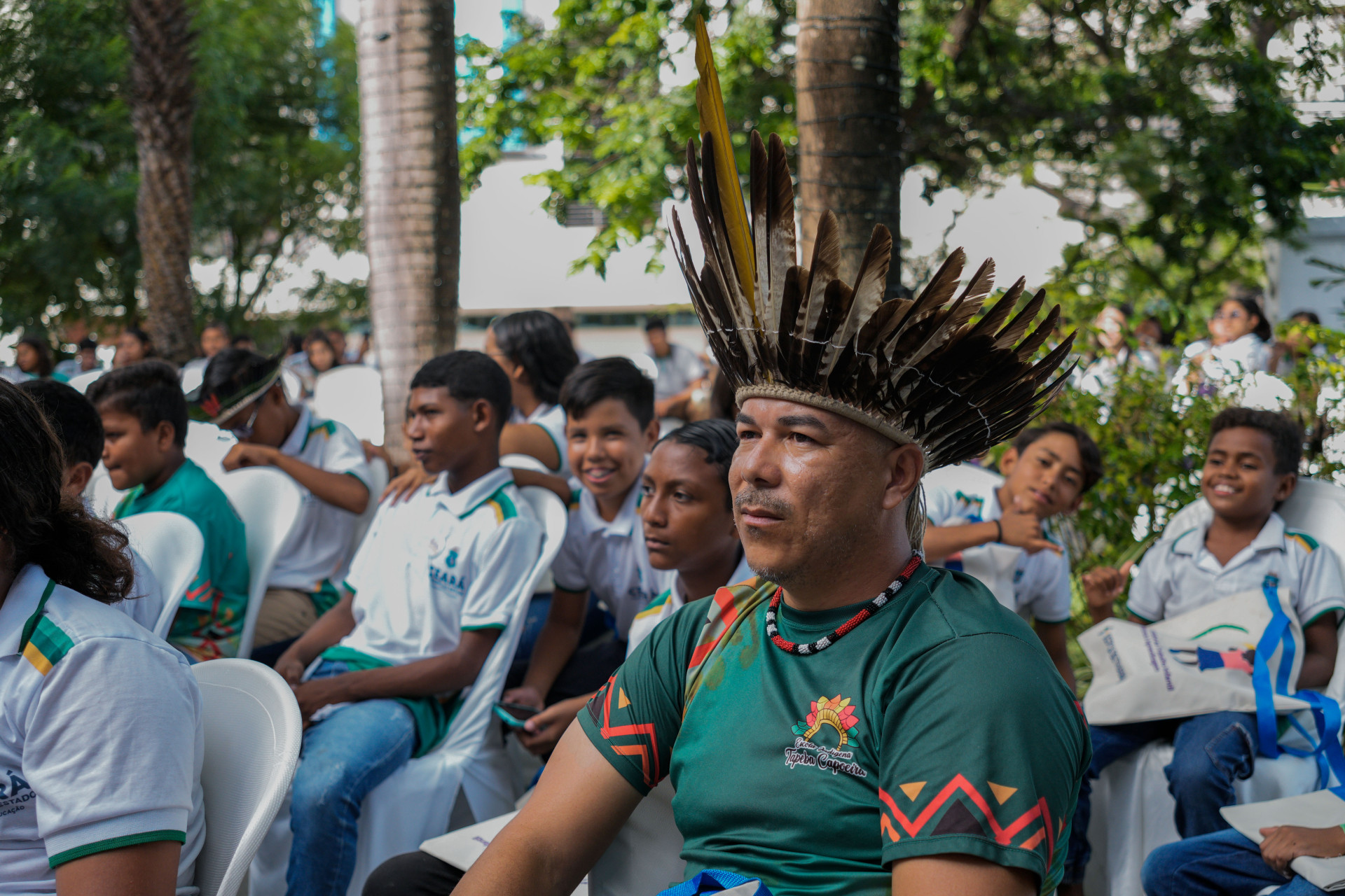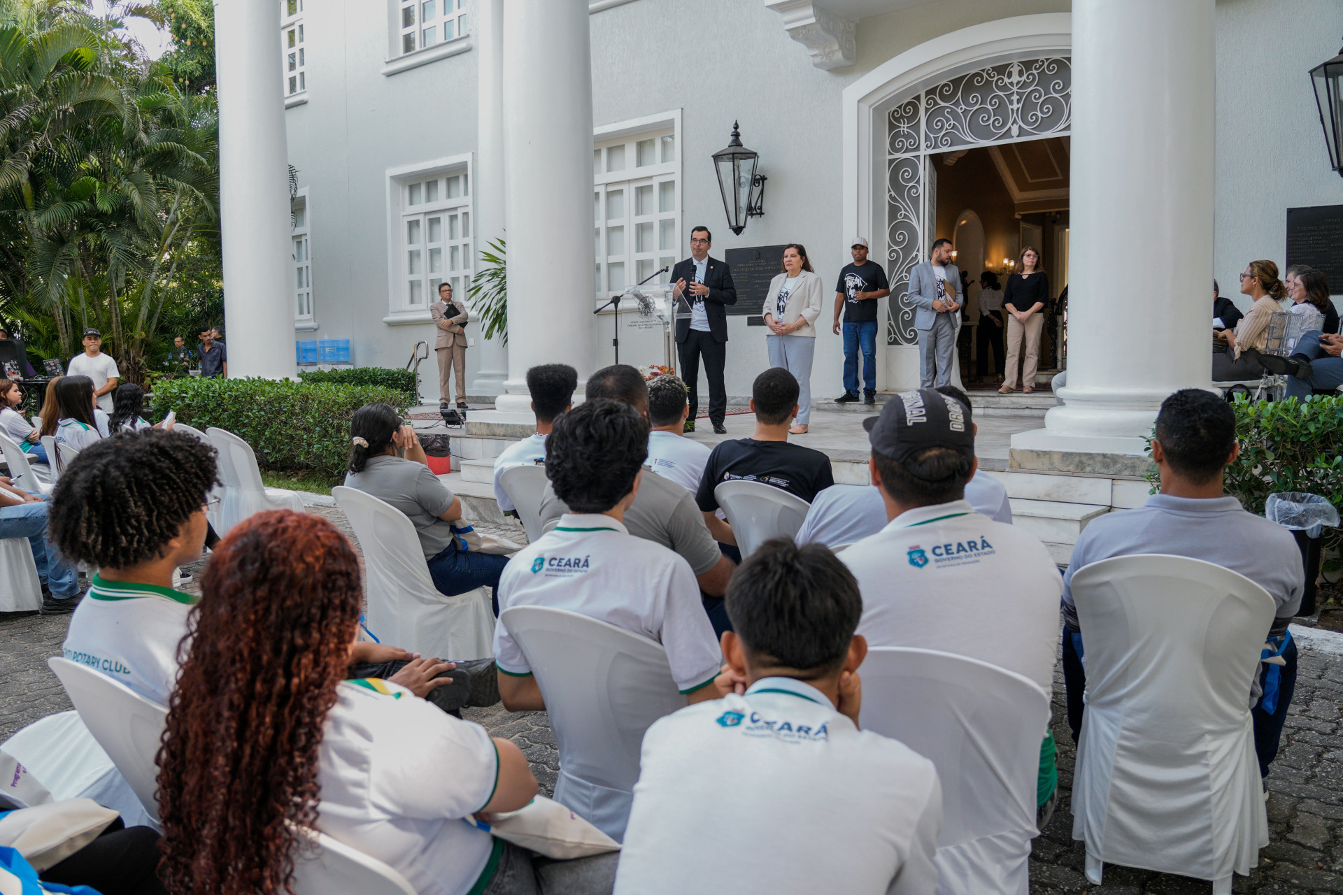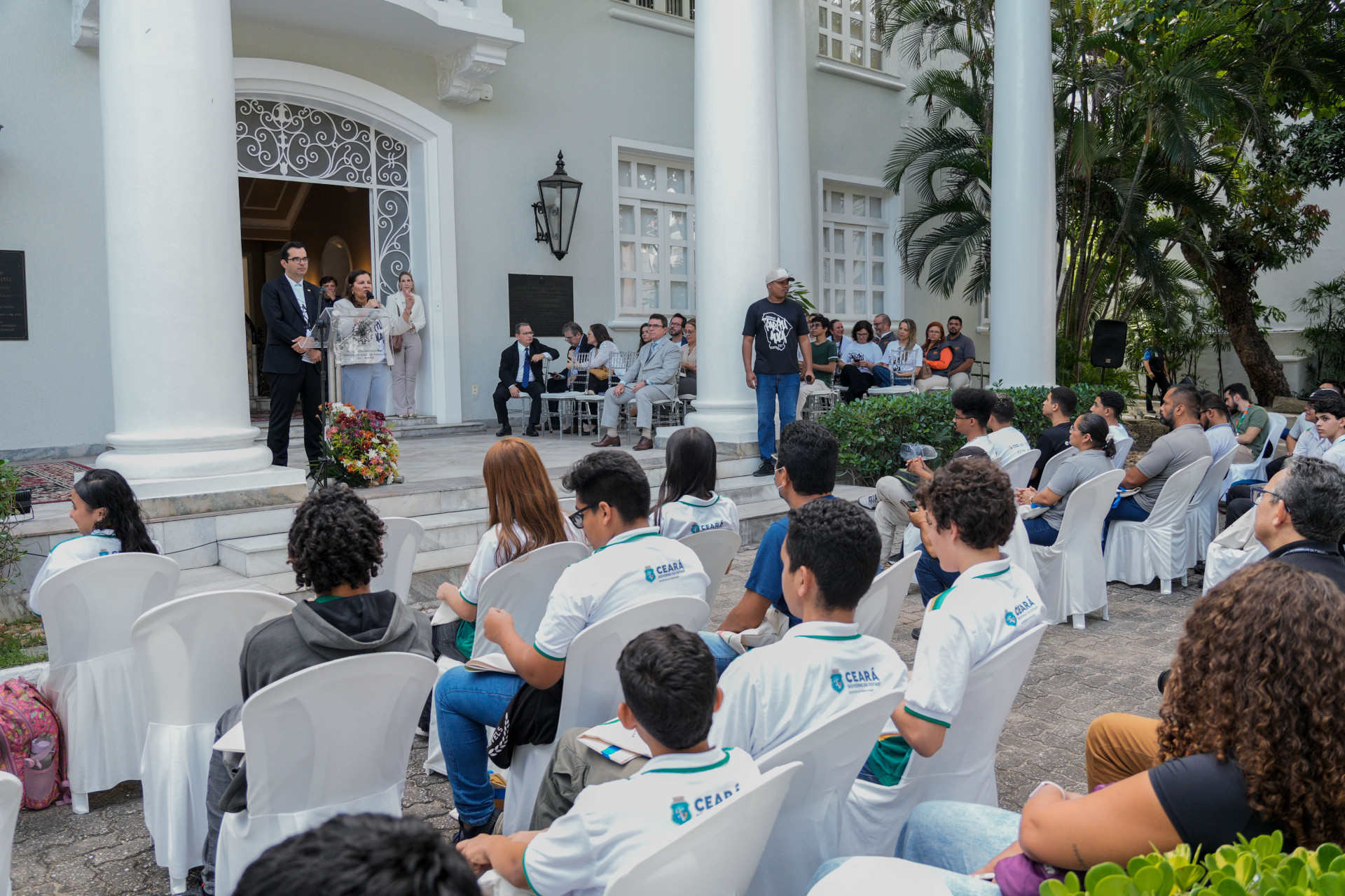 Concentrados na apresentação de hip-hop dos artistas, meninas e meninos das escolas públicas de Caucaia ocupavam o jardim do TRT-CE.
