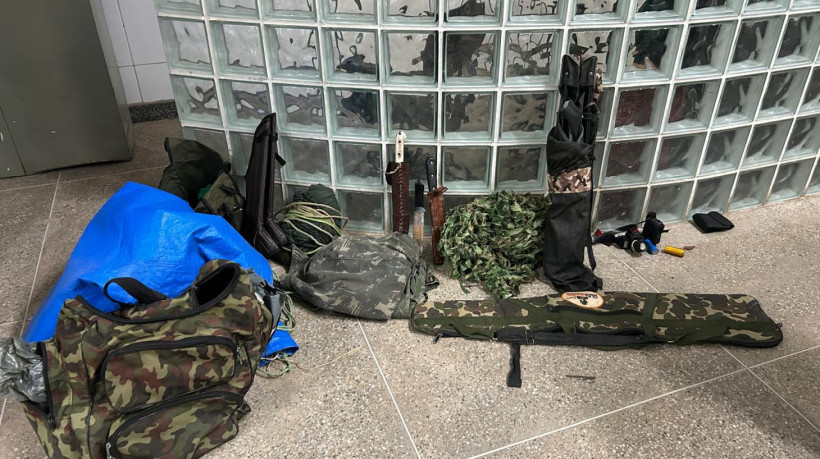 Com o homem os policiais apreenderam um rifle, uma carabina de pressão, 55 munições intactas, duas lunetas, um silenciador, um recipiente com chumbo e diversos apetrechos para caça.