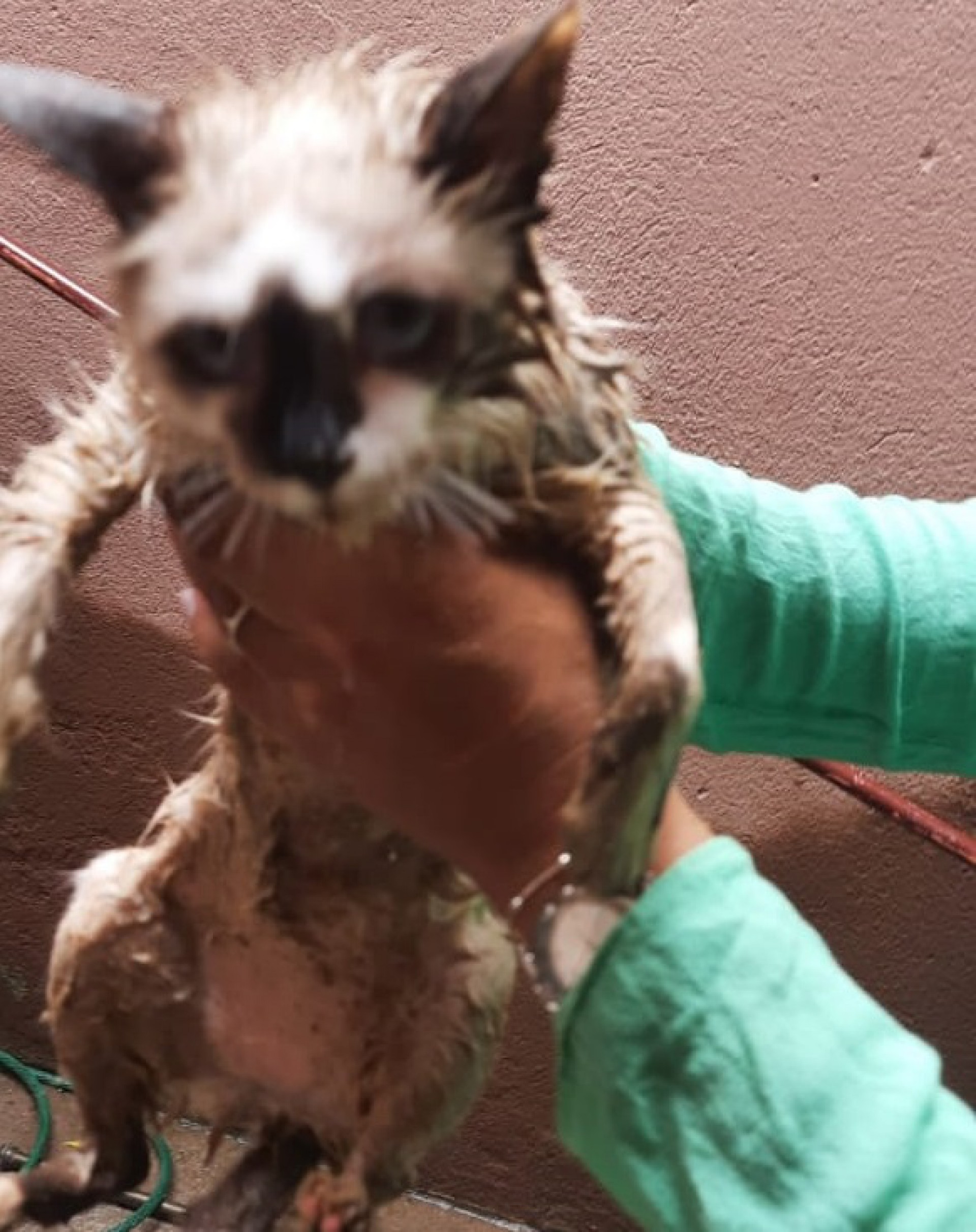 Durante o salvamento, que durou cerca de uma hora, os bombeiros precisaram cavar um buraco no piso do banheiro para romper a tubulação e localizar o ponto exato onde o felino estava preso. Após o uso de técnicas específicas, os agentes conseguiram encontrar o animal com vida. Ele estava bastante molhado e exausto, mas não apresentava nenhum sinal de ferimento.