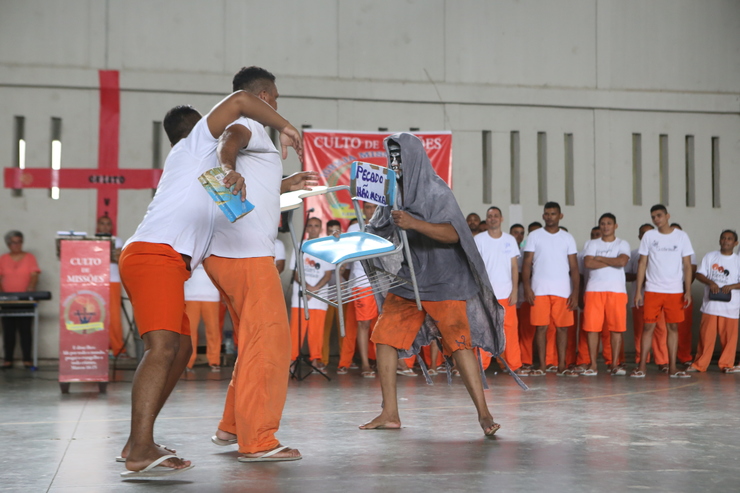 Os 300 internos fazem parte de um área conhecida como “ala dos evangélicos” na unidade prisional. Na cadeira, durante a encenação, a frase Pecado, não mexa mais parecia um convite. Uma das personagens não resistiu e, não só mexeu, como sentou, jogou, brincou com o assento. Outras pessoas passavam por ele, que rogava por ajuda, mas ninguém se movia em seu socorro. Até que um homem, com um livro na mão, foi em sua direção . A obra era a Bíblia e foi apresentada ao homem que brincou com o pecado como forma de salvação.