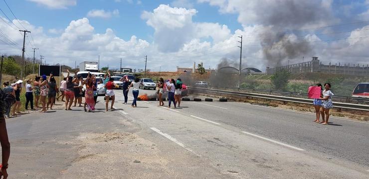 [FOTO1]Familiares de presos bloqueiam, nesta manhã de quarta-feira, 7, a BR-116 na altura do quilômetro 27, em protesto. A manifestação acontece em Itaitinga, onde é situado o complexo de penitenciárias do Estado. Mulheres começaram a queimar pneus e interditar a rodovia por volta das 10 horas, de acordo com a Polícia Rodoviária Federal (PRF). A via permaneceu totalmente bloqueada até as 11h25min, quando foi liberada.
