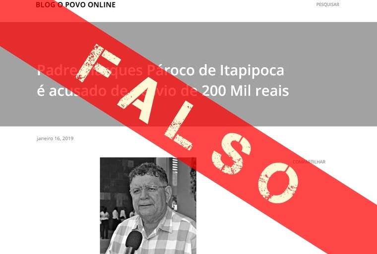 Pároco da Igreja Católica Nossa Senhora das Mercês, em Itapipoca, padre Marques foi acusado nesta quinta-feira, 17, de desviar R$ 200 mil da instituição. Contudo, a denúncia é feita por site usando nome do O POVO Online. O blog não pertence e não está vinculado ao Grupo de Comunicação O POVO.
