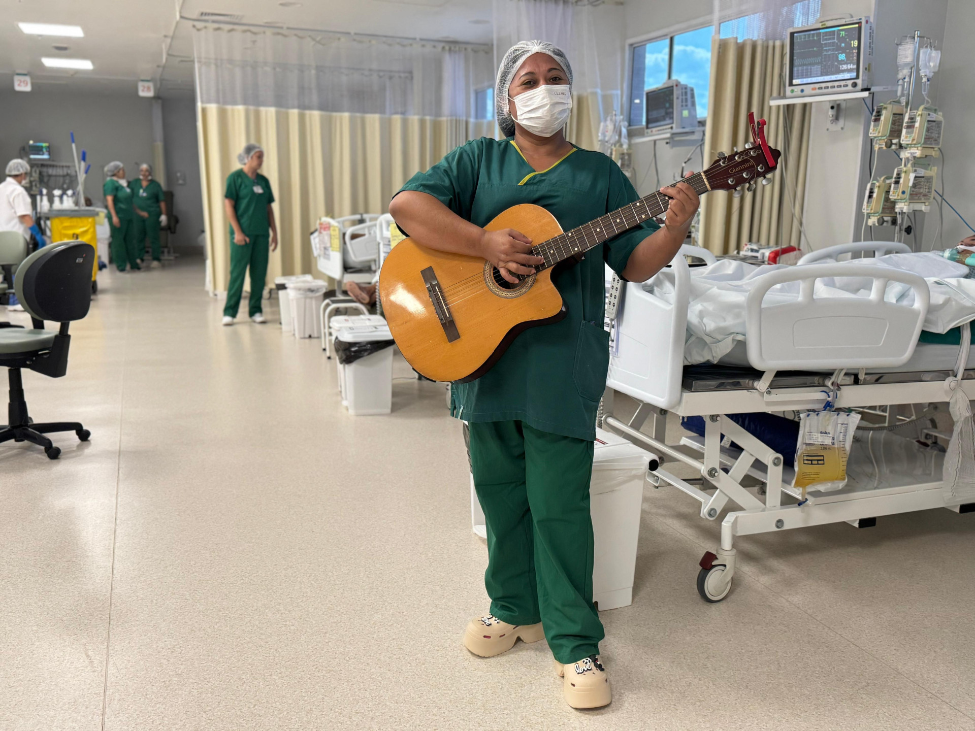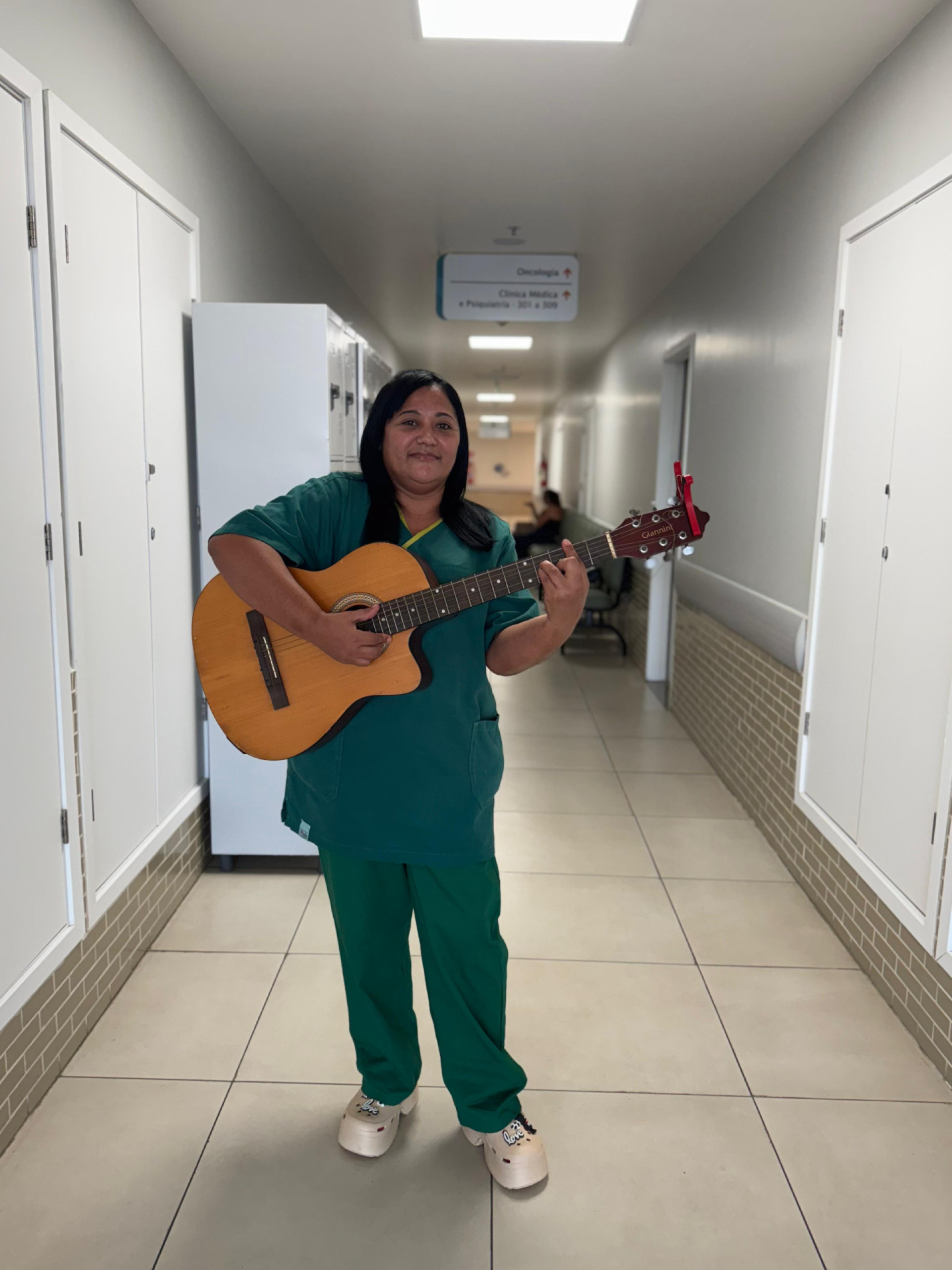 “Eu amo música! Então, sempre que você me ver perto de um paciente, vai me ver cantando. Eles sempre diziam: ‘aí, canta mais um pouquinho pra mim, eu gostei tanto’. Isso uniu meus dois amores: um primeiro amor e um amor recente, que é trabalhar diretamente com as pessoas, cuidando das pessoas que no momento estão impossibilitadas de cuidar de si próprias”, relata emocionada.