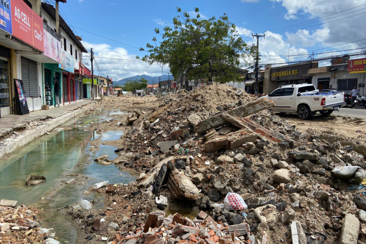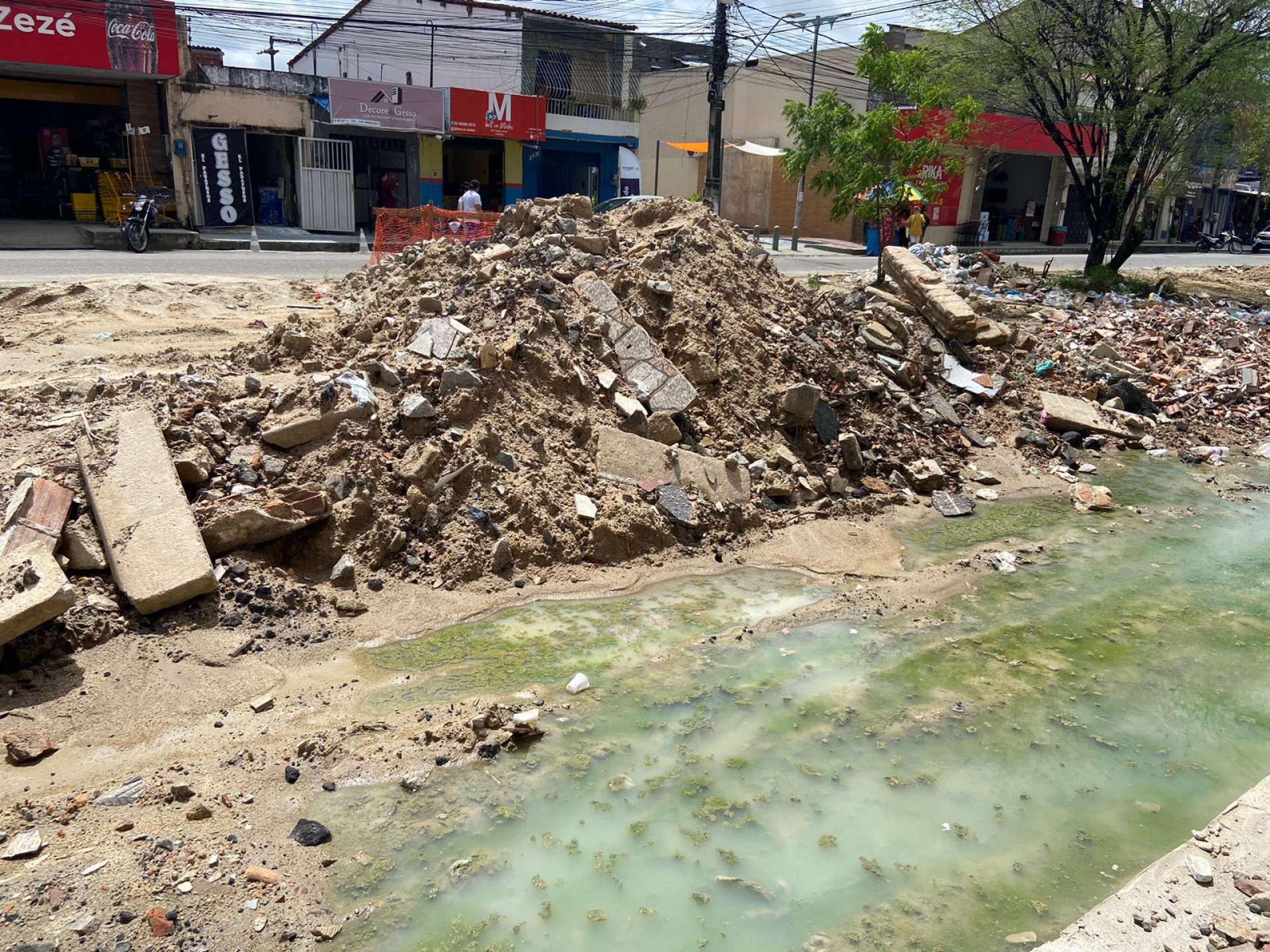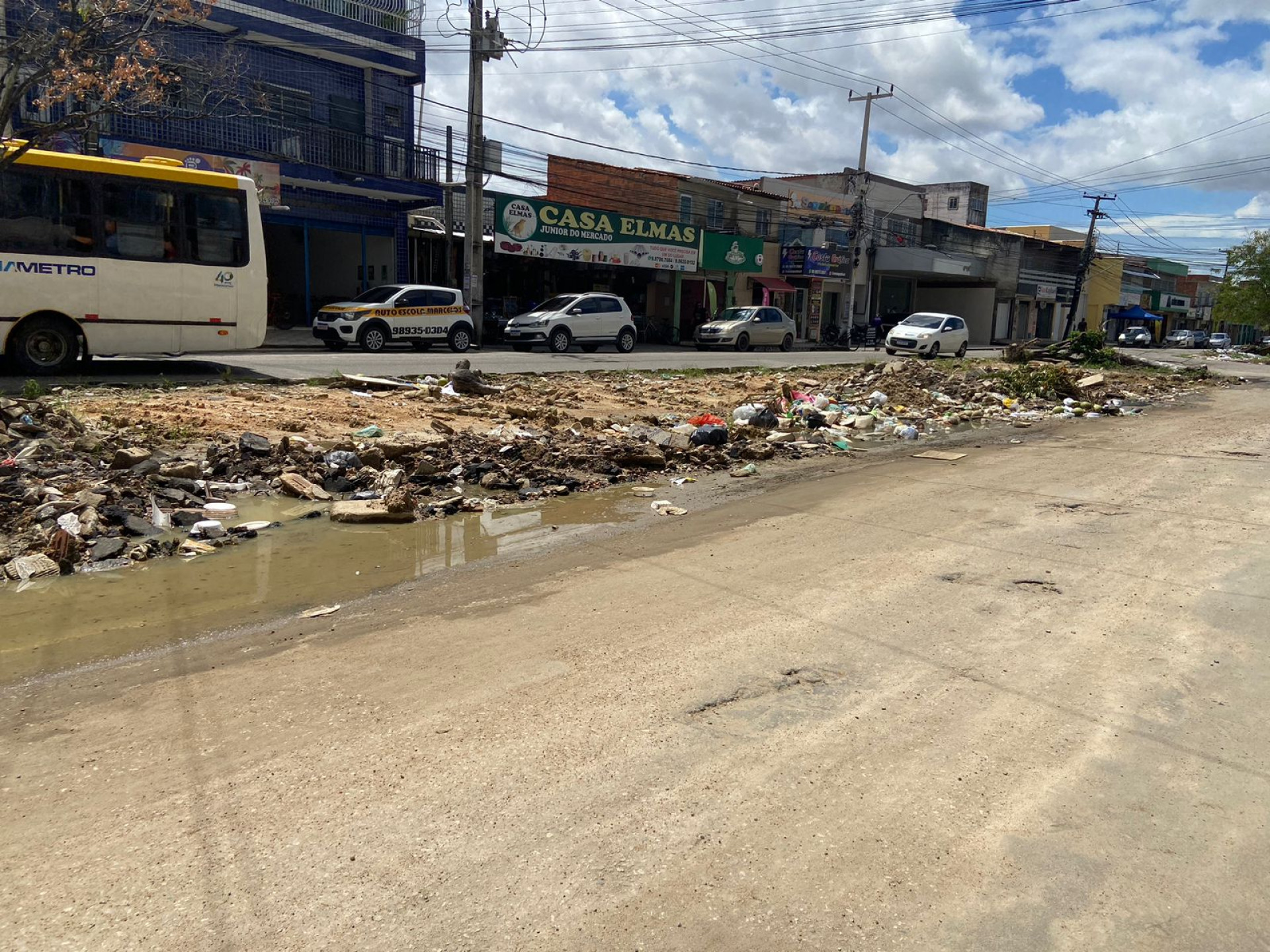 Comerciantes da avenida Narciso Pessoa de Araújo (antiga avenida 7), no bairro Jereissati, em Maracanaú, denunciaram na última semana que uma obra de requalificação da via está parada há mais de X dias. A via apresenta acúmulo de lixo e entulho. Os moradores dizem que o local é foco de doenças em virtude das poças de água formadas.
