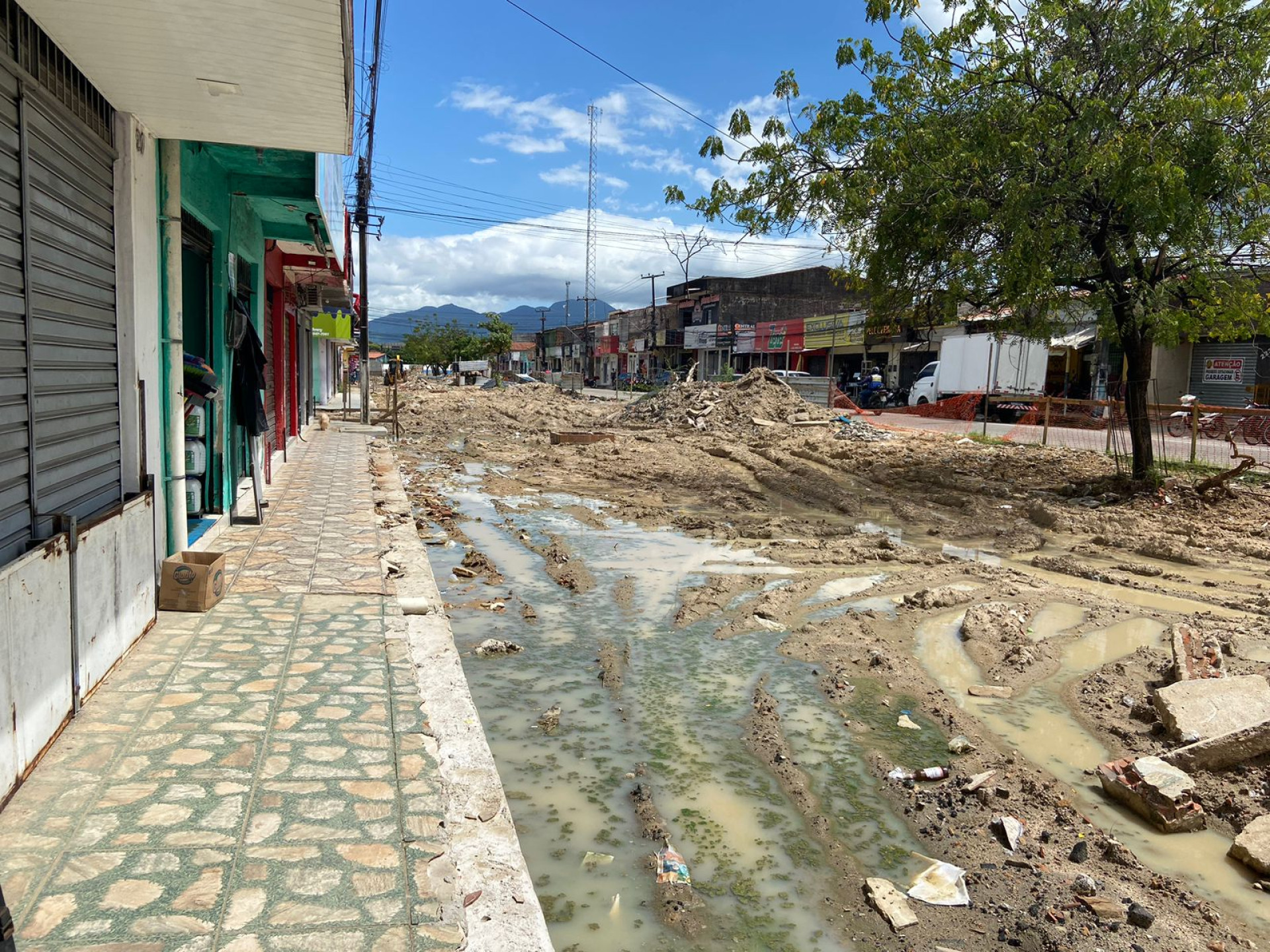 “Falaram que tinha que começar porque tinha que começar. Foram iniciadas as obras e falaram que iam ser por etapas. No entanto, eles quebraram todo o calçadão da avenida, ocasionando água parada desde então, muita água parada, já estamos com alta incidência de dengue, que é preocupante, além de entulho e lama. Agora, eles afirmam que não podem continuar devido à lama porque o trator atola”, disse a empresária.