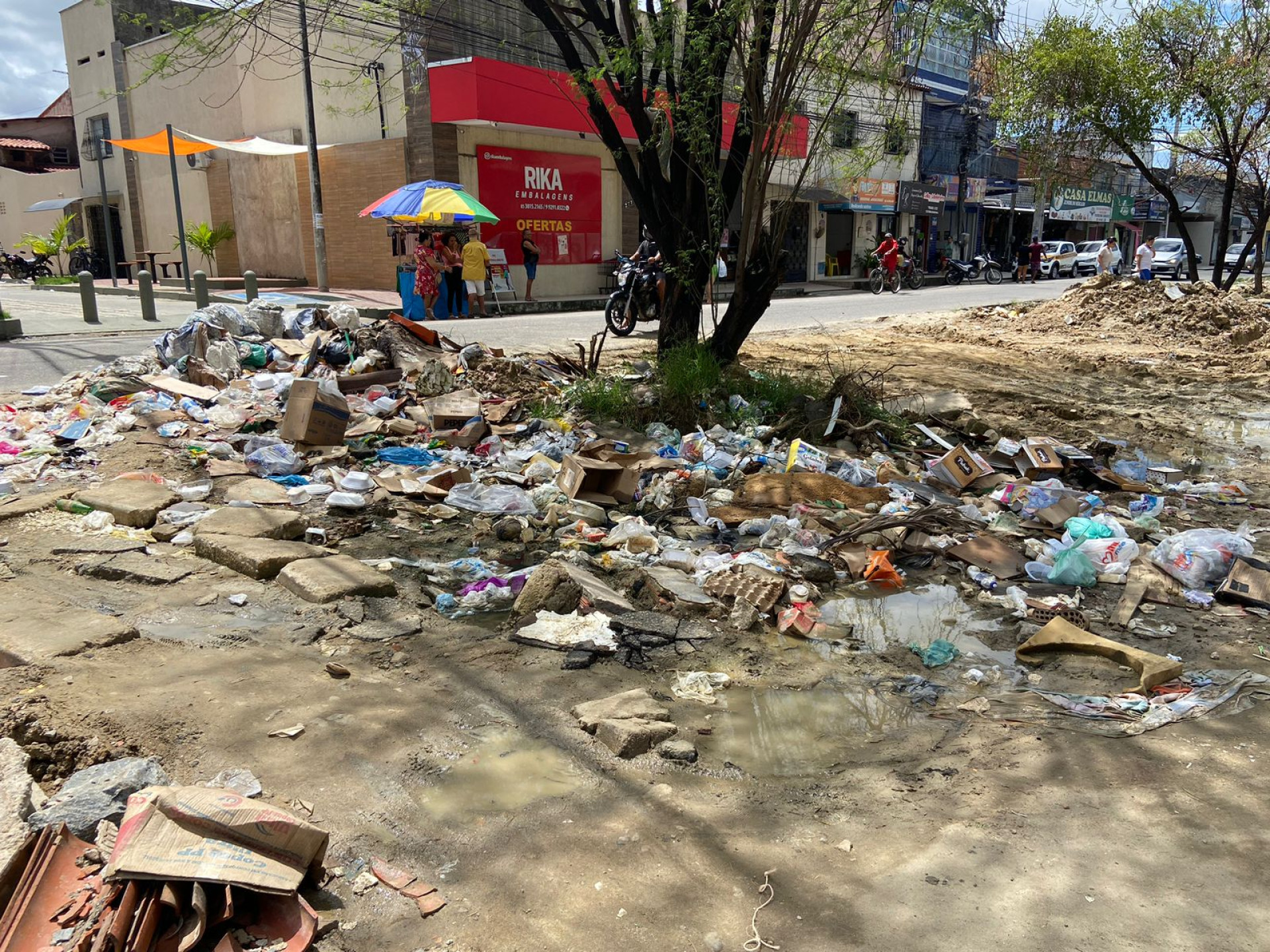 Comerciantes denunciam obra parada com acúmulo de lixo avenida de Maracanaú