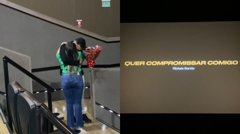 Momento foi planejado pelo namorado junto com amigos da parceira. Pedido foi feito em cena pós créditos de filme que o casal assistia