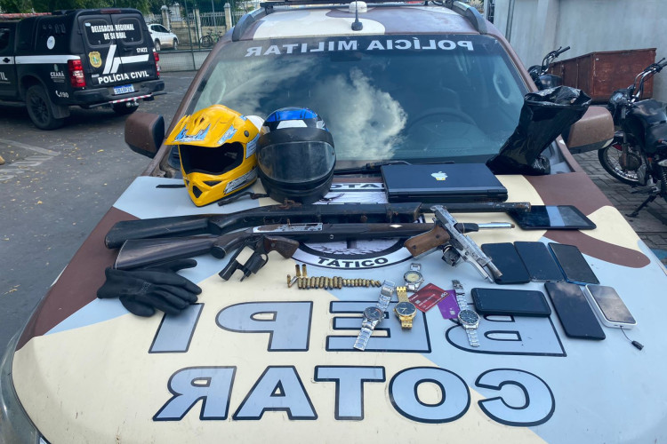Na casa, foram encontrados e apreendidos uma pistola, um revólver, uma espingarda artesanal, um rifle, munição, maconha (16 gramas), cocaína (7 gramas), crack (16 pedras), relógios, tablet, maquineta de cartão, cinco celulares, notebook, cadernos, luvas, sacos para embalar drogas, placa de moto e dois capacetes.