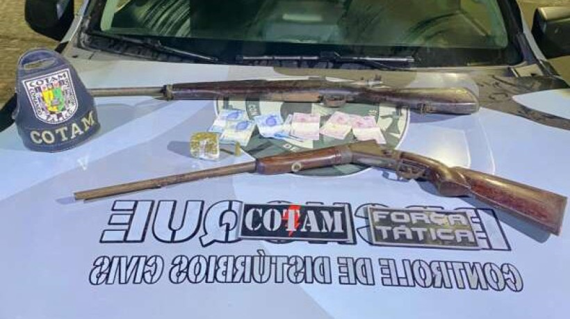 Conforme a PM, o imóvel foi cercado e, durante a ação, os militares flagraram o instante em que um saco preto foi arremessado. No interior da sacola, estavam as armas de fogo. A droga foi encontrada na sala da casa. Os dois homens foram presos.