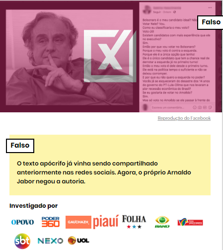 O Boatos.Org também já desmentiu o suposto apoio de Arnaldo Jabor a Bolsonaro. Em agosto, o jornal O Tempo esclareceu outra farsa envolvendo o nome de Jabor, depois que uma falsa conta atribuída ao cineasta defendeu a candidatura de João Amoêdo (Novo) no Twitter.