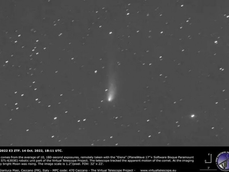 Visto pela última vez por neandertais, na Pré-História, há 50 mil anos, o cometa C/2022 E3 (ZTF) deve passar próximo à Terra nas próximas semanas. Os amantes de astronomia poderão observá-lo a olho nu, devido a sua forma forma grande e brilhante. A imagem do corpo celeste foi capturada em outubro, por membros do projeto Virtual Telescope, e mostra o objeto se movendo em contraste ao fundo repleto de estrelas.