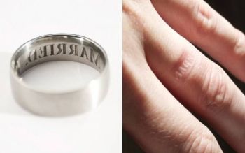 A aliança "antitraição" deixa marca no dedo em que se lê a palavra "married" (que significa 'casado' em inglês).