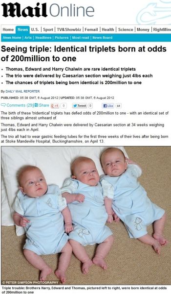 Além de serem frutos de uma gestação pouco comum, os trigêmeos Thomas, Edward e Harry Chalwin são idênticos. A probabilidade disso acontecer é de um para cada 200 milhões de casos.