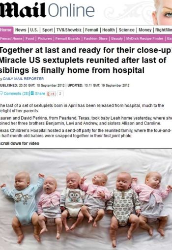A mãe dos bebês, Lauren Perkins, de Pearland, Texas, ficou grávida por meio de inseminação artificial. O procedimento tinha 25% de chances de dar certo, sendo que, a probabilidade de nascerem sêxtuplos era 1 em 100.