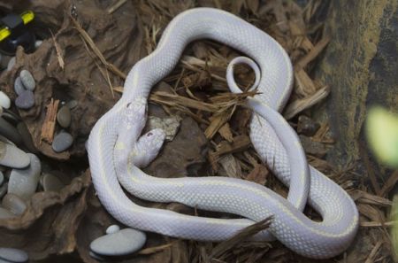 Segundo a agência Associated Press, o animal de pele escamosa branca e olhos vermelhos é um exemplar da espécie cobra real californiana.
