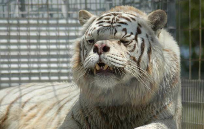 Kenny, fruto do cruzamento de dois tigres brancos irmãos, nasceu com problemas mentais, motores e alterações na face, semelhante aos portadores humanos da Síndrome.