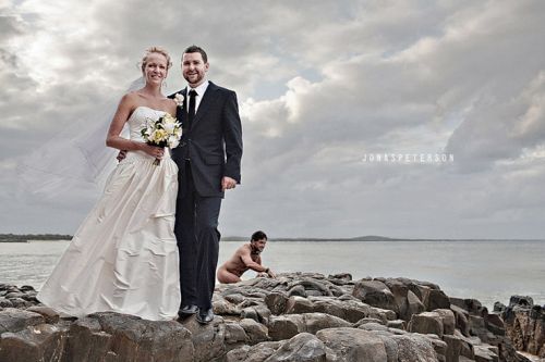 Matt e Tamsin fizeram um tradicional book de seu casamento, mas uma das fotos acabou viralizando no mundo todo, nesta semana. O diferencial da imagem é que uma terceira pessoa foi capturada, sem que os noivos soubessem. E essa pessoa estava nada menos que pelada, acabando de sair do mar de Queensland, na Austrália.