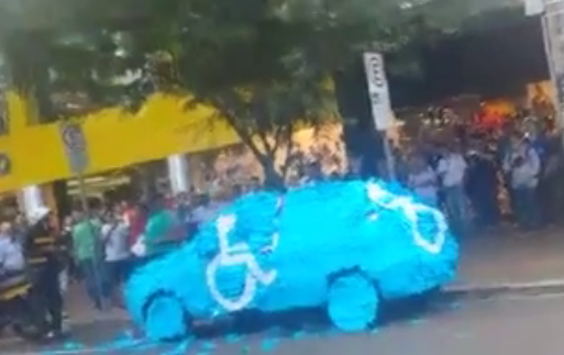 Ao voltar ele foi surpreendido com seu transporte todo coberto por uma espécie de adesivo azul com imagens de cadeirantes. O condutor do veículo teve dificuldade de sair dirigindo. "Agora corta as pernas", disse uma mulher.