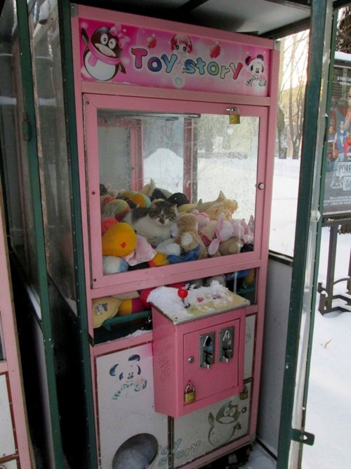 Se no Brasil o calor faz com que os animais procurem os lugares mais frescos e arejados, o frio europeu leva os bichinhos a procurarem lugares quentinhos para se aquecer. Na Sérvia, por exemplo, um gato foi parar dentro de uma máquina de bichos de pelúcia tentando escapar do frio de -2°C na cidade de Vrnjacka Banja.