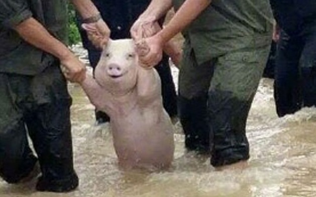 A foto de um porco "sorrindo" enquanto é resgatado durante uma enchente, em Guangxi Zhuang, na China, viralizou nas redes sociais e está inspirando memes.