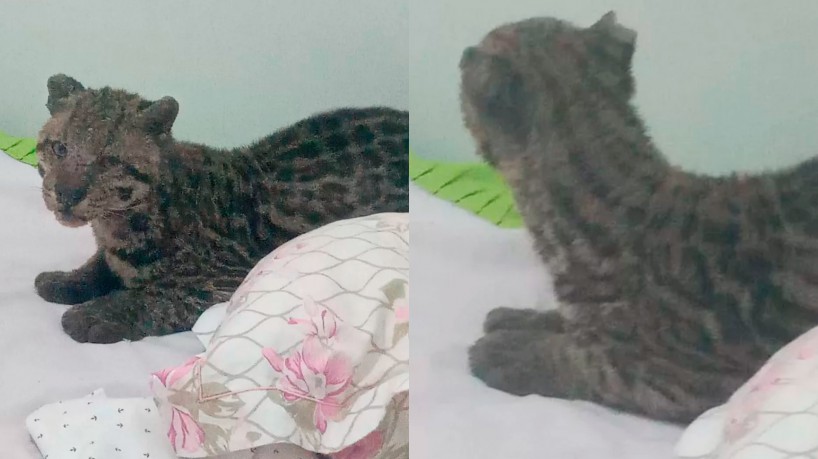 O homem, de 53 anos, contou que ao sair de casa, deixou a janela do quarto do filho aberta. Quando chegou, viu que a jaguatirica estava em cima da cama.