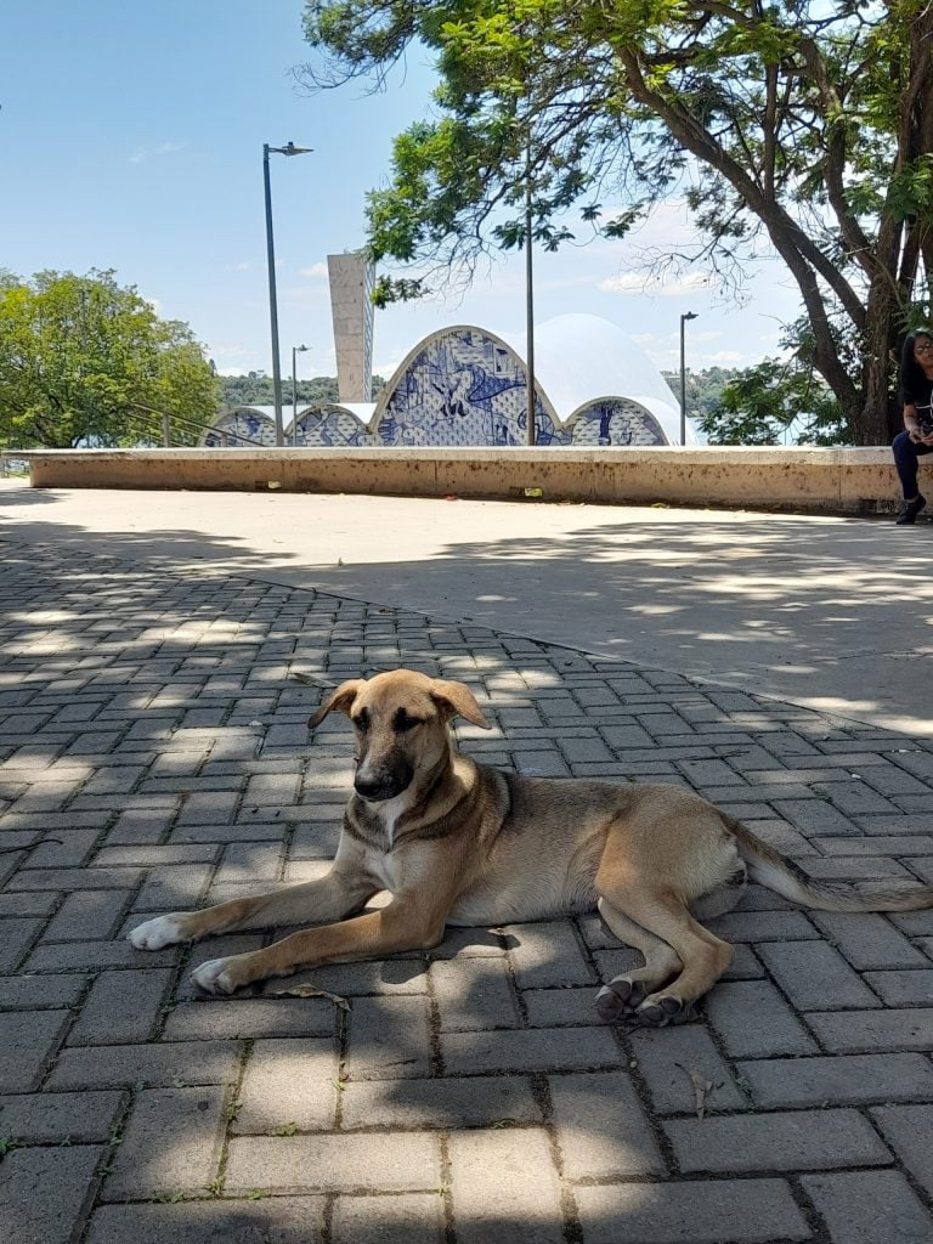 O cachorro entrou e se deitou exatamente na frente do cachorro retratado por Cândido Portinari na obra que ilustra o painel da Igreja da Pampolha; confira