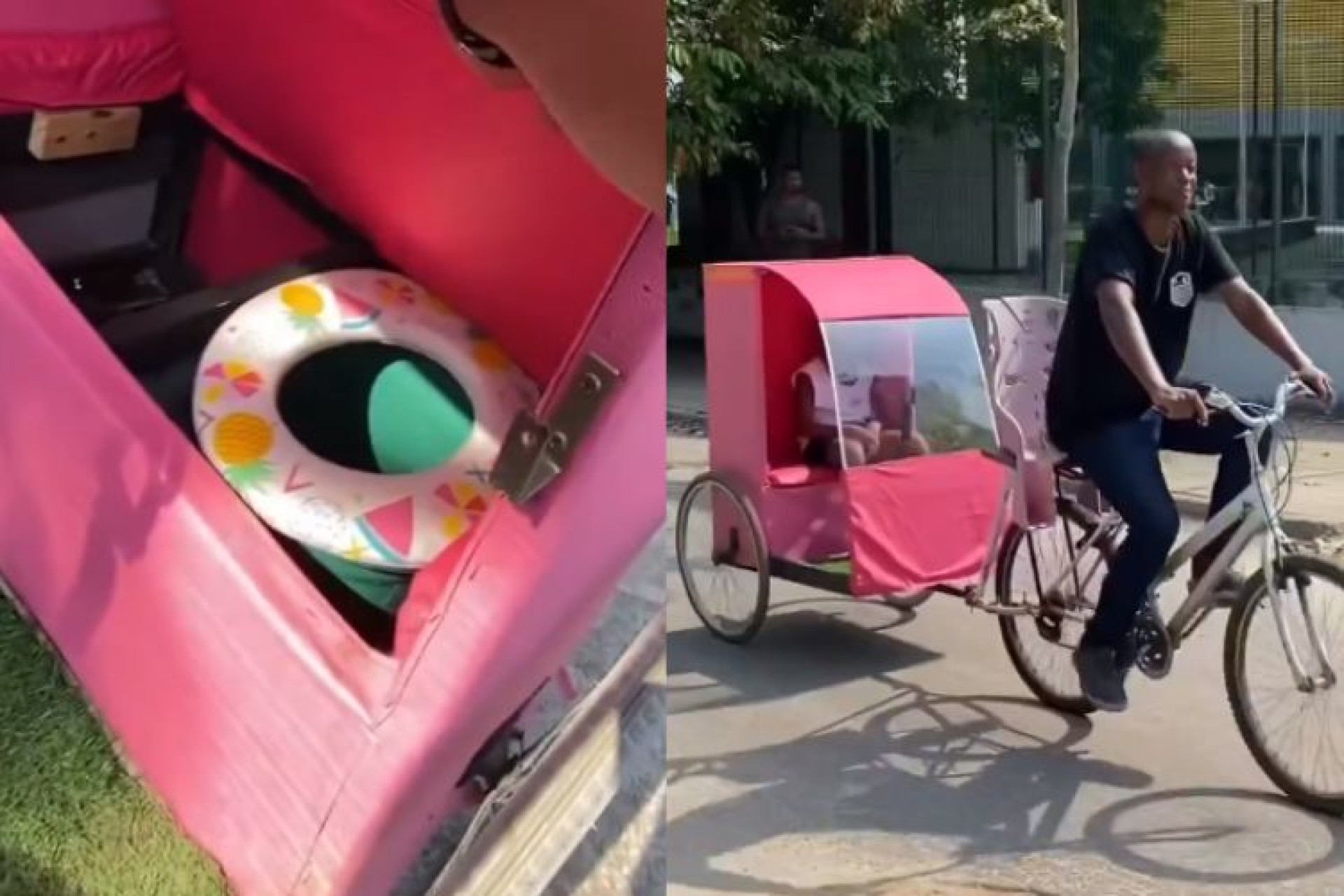 Um homem, de 42 anos, construiu uma 'carruagem’ rosa para levar sua filha, de 6 anos, até a escola com conforto. O veículo foi projetado em 2023 e desperta olhares curiosos na região de Inhoaíba, bairro na Zona Oeste do Rio de Janeiro.