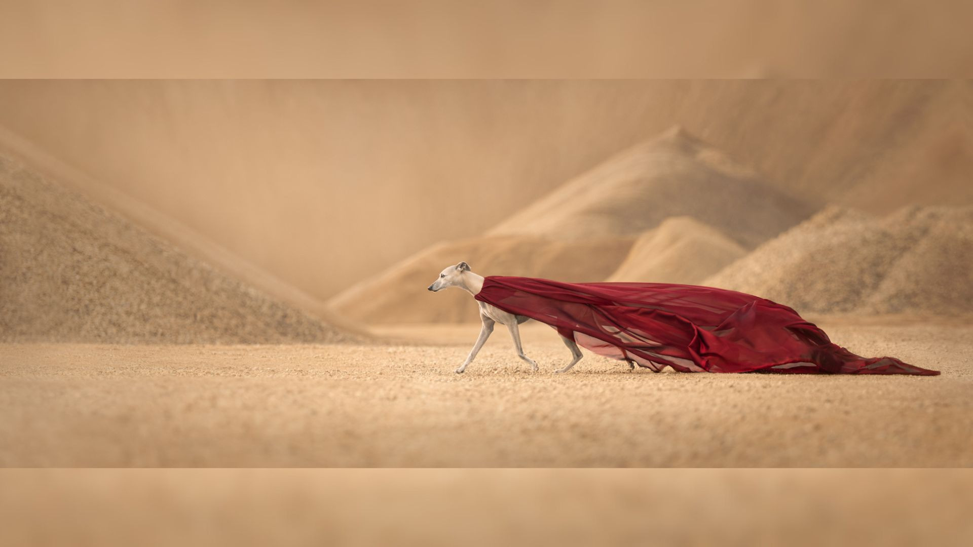 A foto mostra um cachorro da raça whippet chamado Rebelle, envolto em uma capa vermelha esvoaçante que adiciona um ar de majestade e drama à cena.