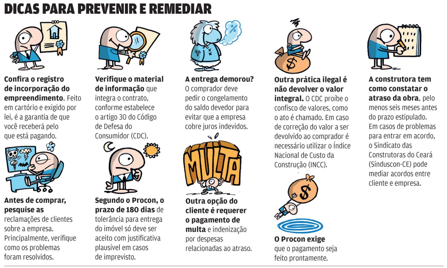 De acordo com Clausens Duarte, diretor do Sindicato da Indústria da Construção Civil no Ceará (Sinduscon CE), a construtora tem como constatar o atraso da obra, pelo menos seis meses antes do prazo estipulado. “Quando isso acontece, a orientação do Sinduscon é que as empresas procurem os clientes pessoalmente, expliquem a situação e tentem entrar em um acordo”, conta.