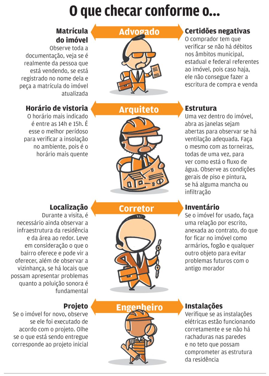 Do ponto de vista da engenharia civil, se o imóvel for novo, é extremamente importante observar se ele foi executado de acordo com o projeto, diz o engenheiro Geraldo Magela. “Olhe se o que está sendo entregue corresponde ao projeto inicial. Se disseram que iriam colocar tal piso, é importante que ele seja do jeito que foi acertado”, diz.